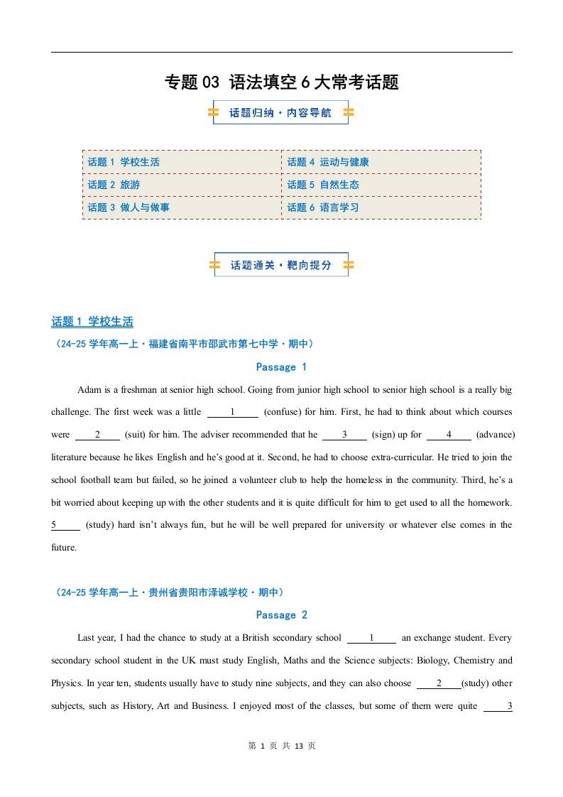 考前押题03 语法填空6大常考话题(期中专项训练)(原卷版)