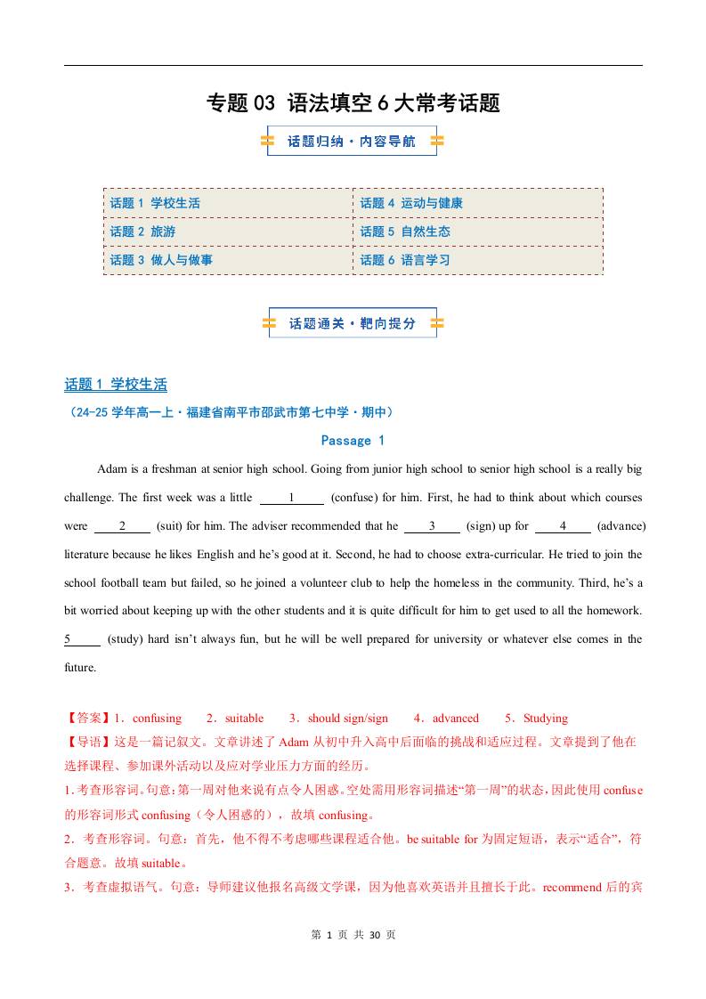 考前押题03 语法填空6大常考话题(期中专项训练)(解析版)