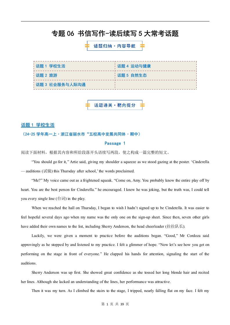 考前押题06 读后续写5大常考话题(期中专项训练)(原卷版)