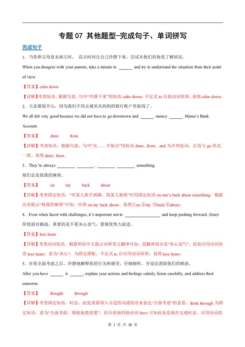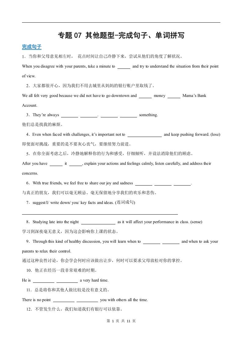考前押题07 其他题型(完成句子、单词拼写)(期中专项训练)(解析版)