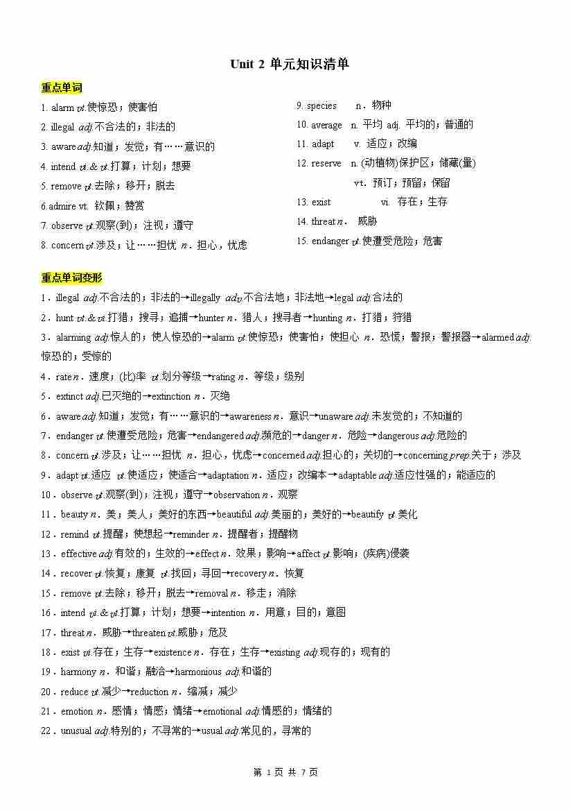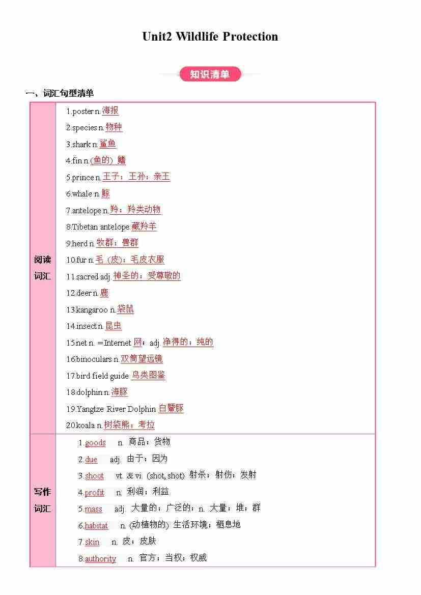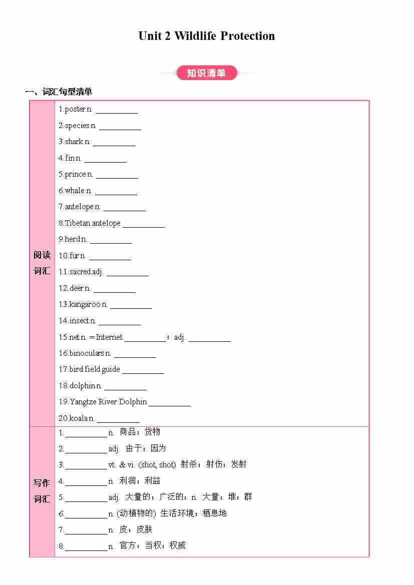 Unit 2 Wildlife Protection 知识清单(默写版)