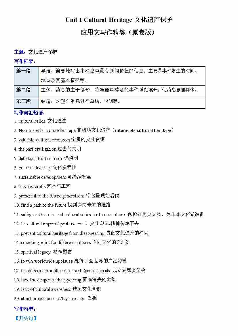 Unit 1 Cultural Heritage文化遗产保护(单元应用文写作精练)(原卷版)