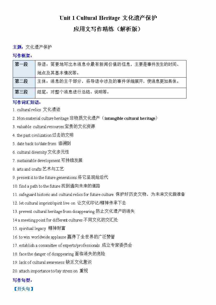 Unit 1 Cultural Heritage文化遗产保护(单元应用文写作精练)(解析版)