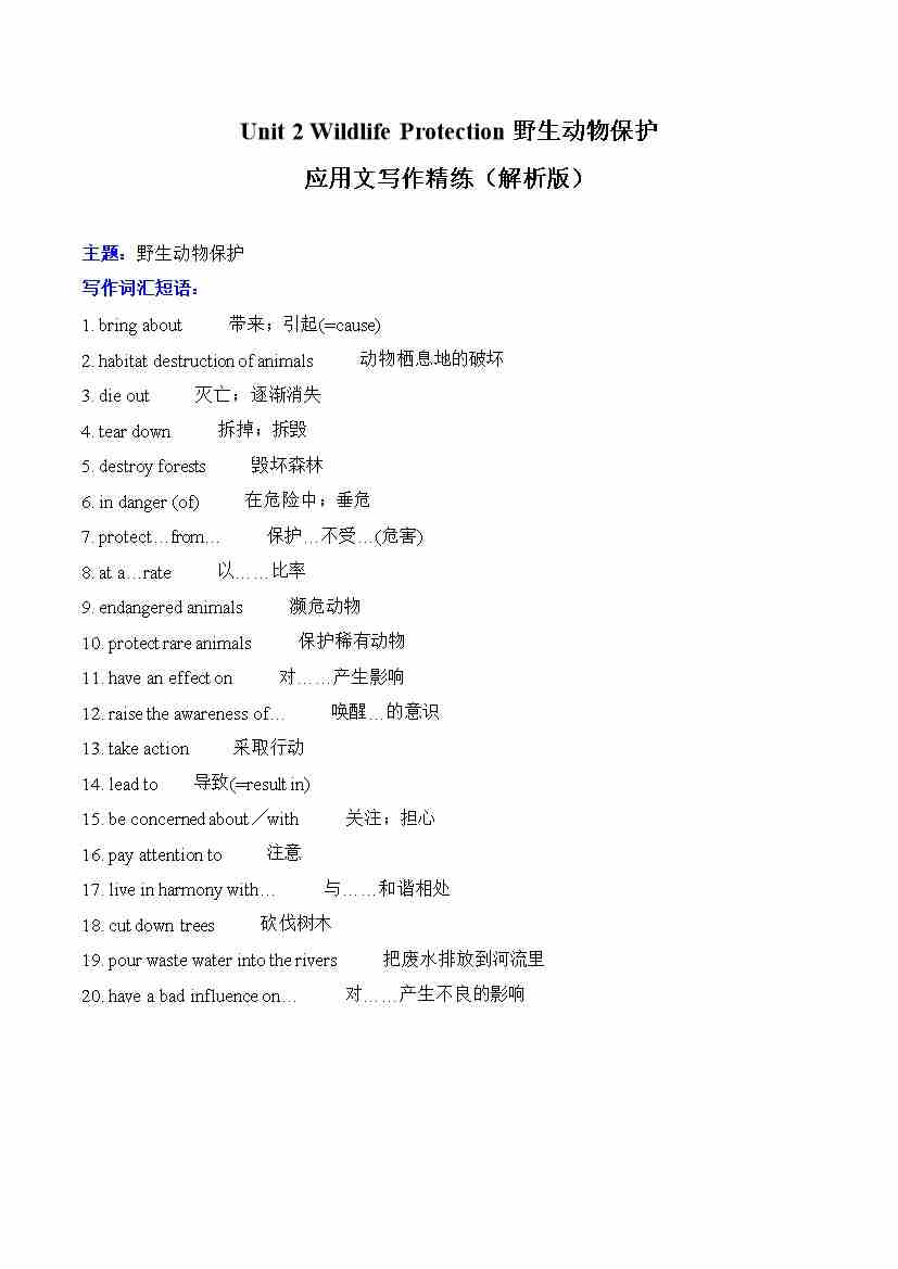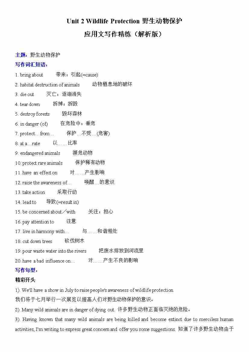 Unit 2 Wildlife Protection 应用文写作精练(解析版)