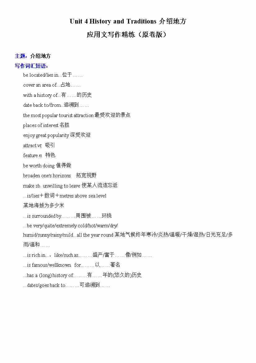 Unit 4 History and Traditions介绍地方 应用文写作精练(原卷版)