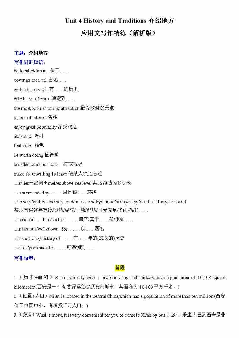 Unit 4 History and Traditions介绍地方 应用文写作精练(解析版)