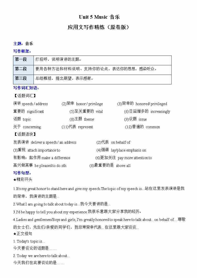 Unit 5 Music音乐应用文写作精练(原卷版)