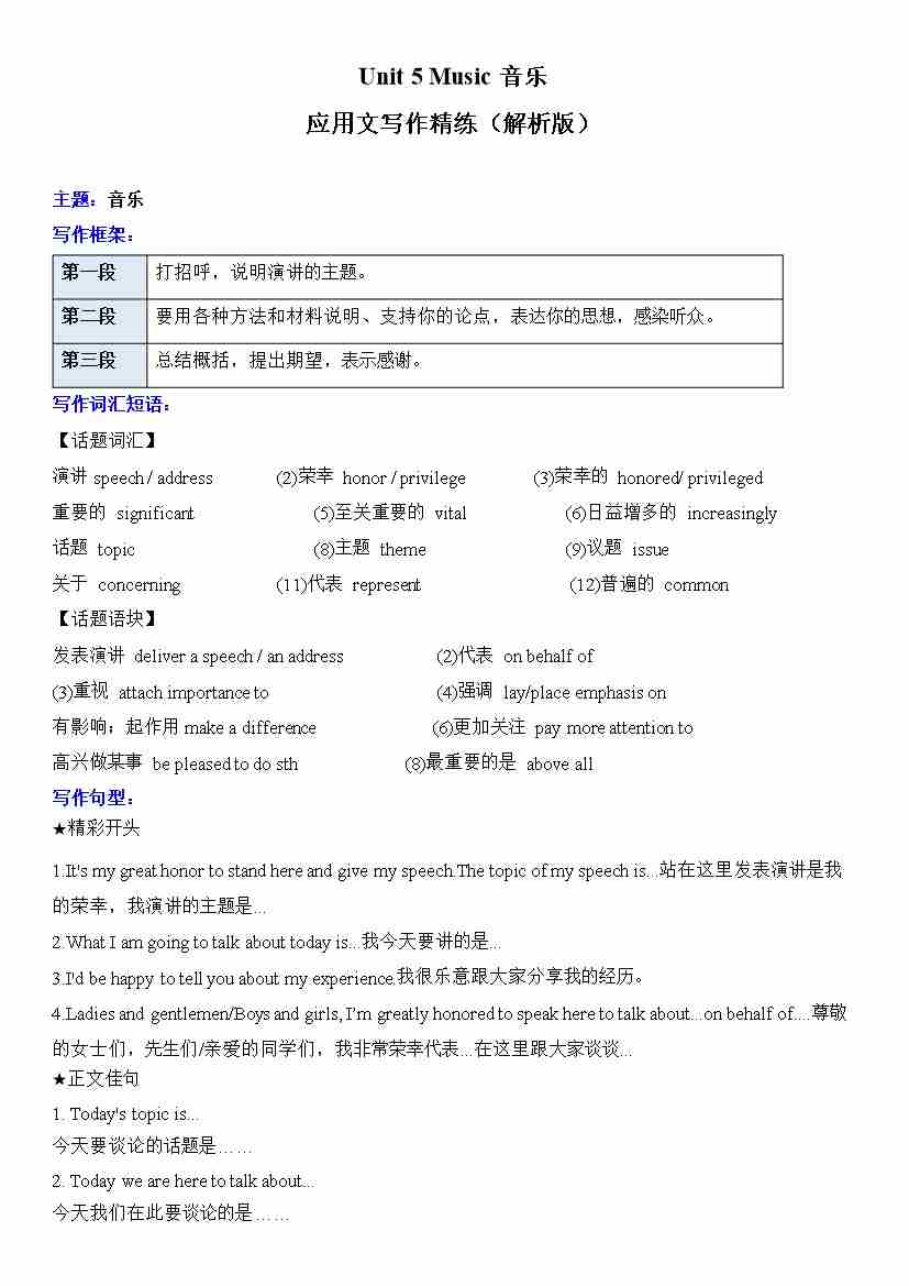 Unit 5 Music音乐应用文写作精练(解析版)