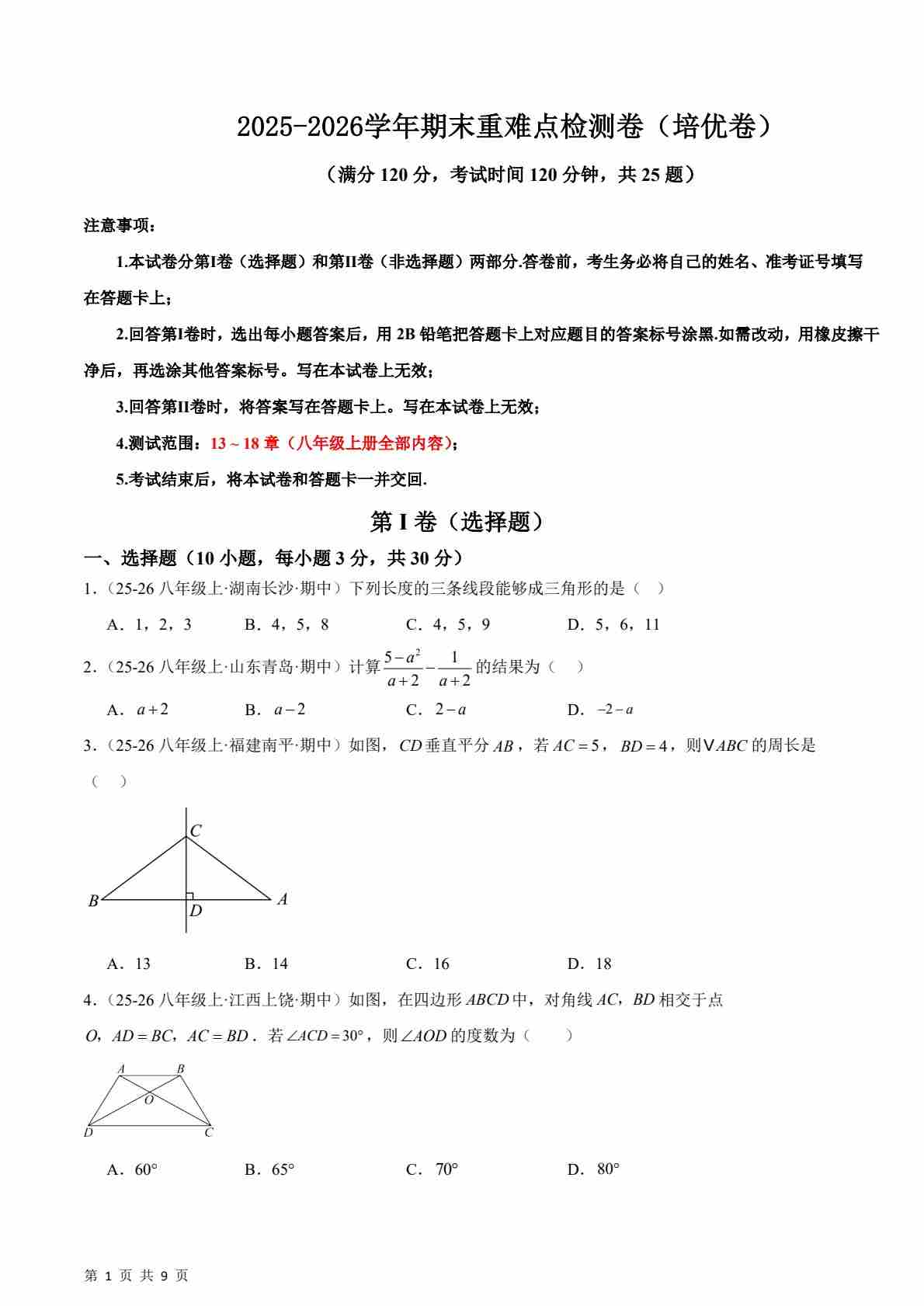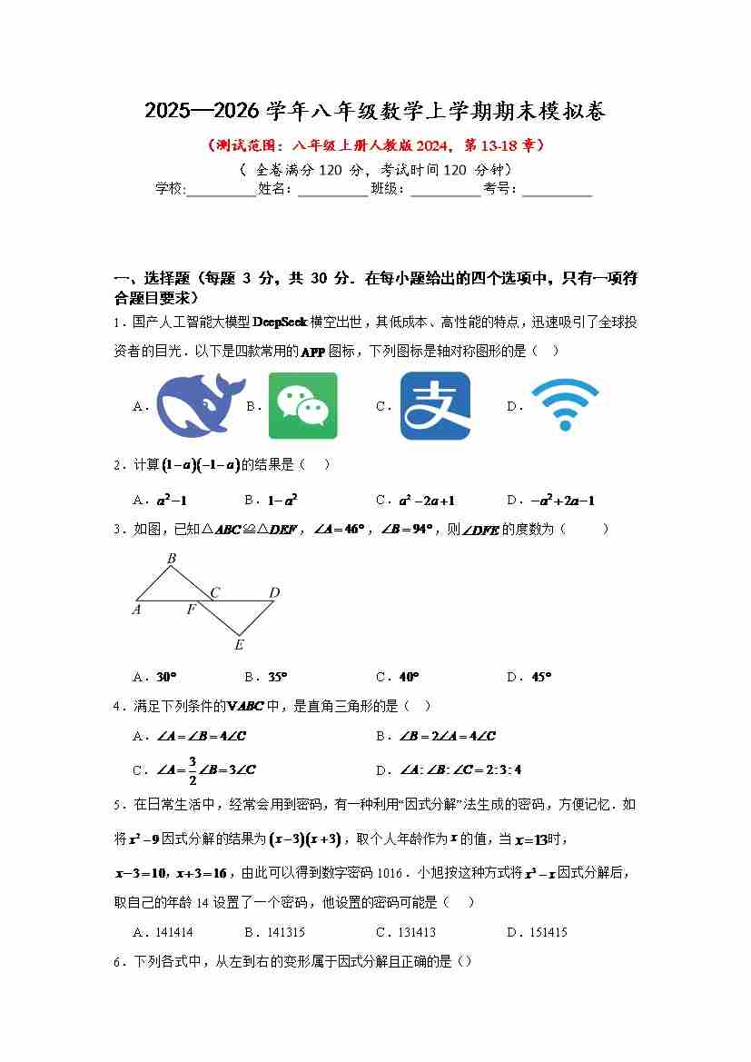2025-2026学年人教版八年级数学上册期末模拟卷(测试范围:第13-18章) 原卷