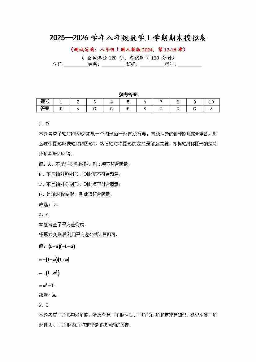 2025-2026学年人教版八年级数学上册期末模拟卷(测试范围:第13-18章) 答案