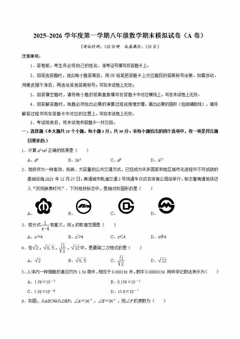 2025-2026学年人教版八年级数学上学期期末模拟试卷(A卷)原卷