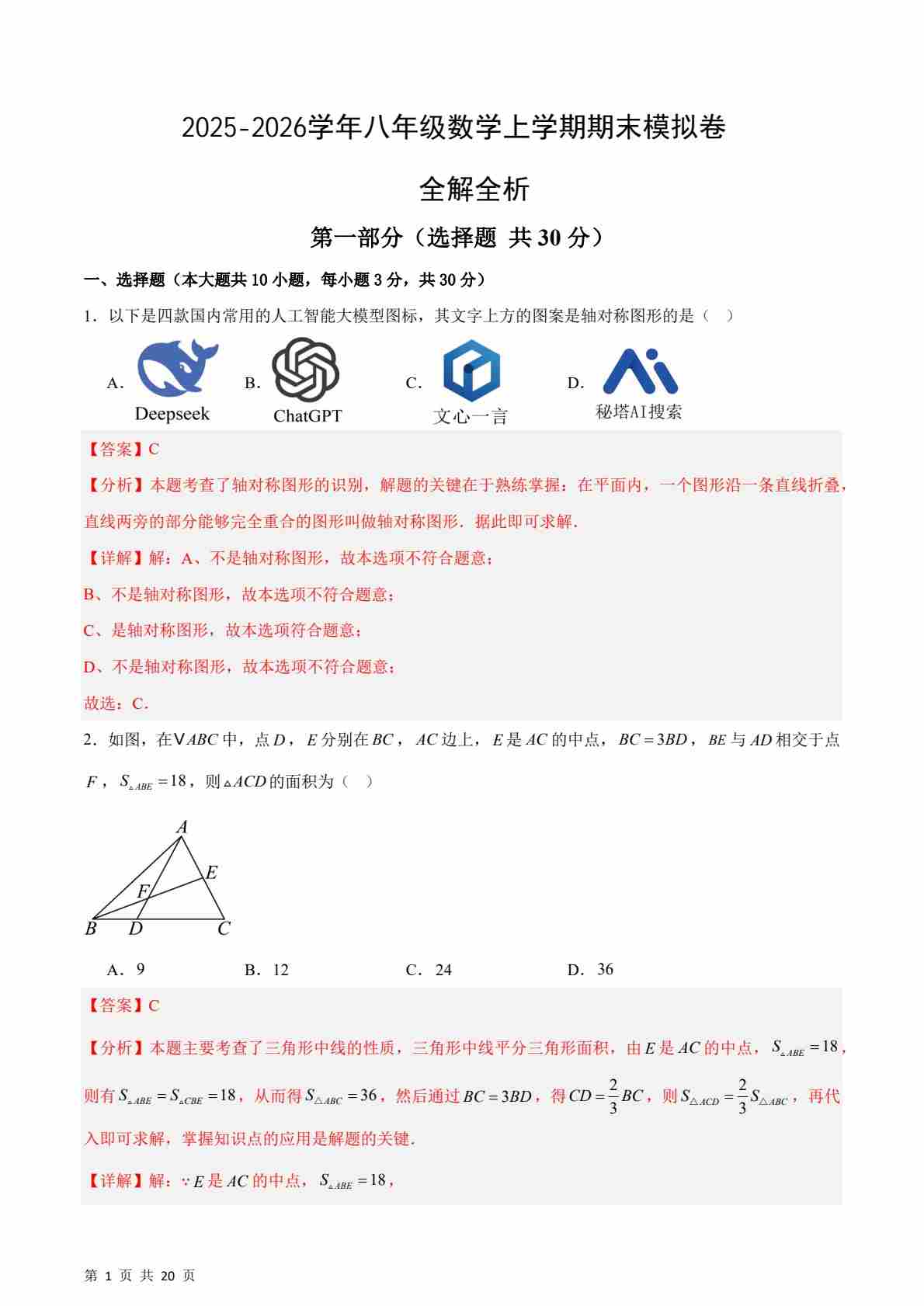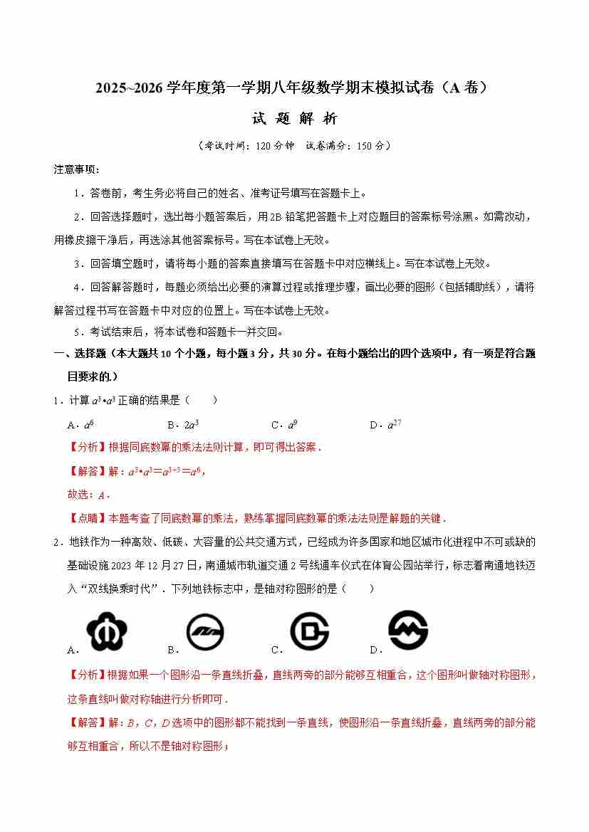 2025-2026学年人教版八年级数学上学期期末模拟试卷(A卷)解析