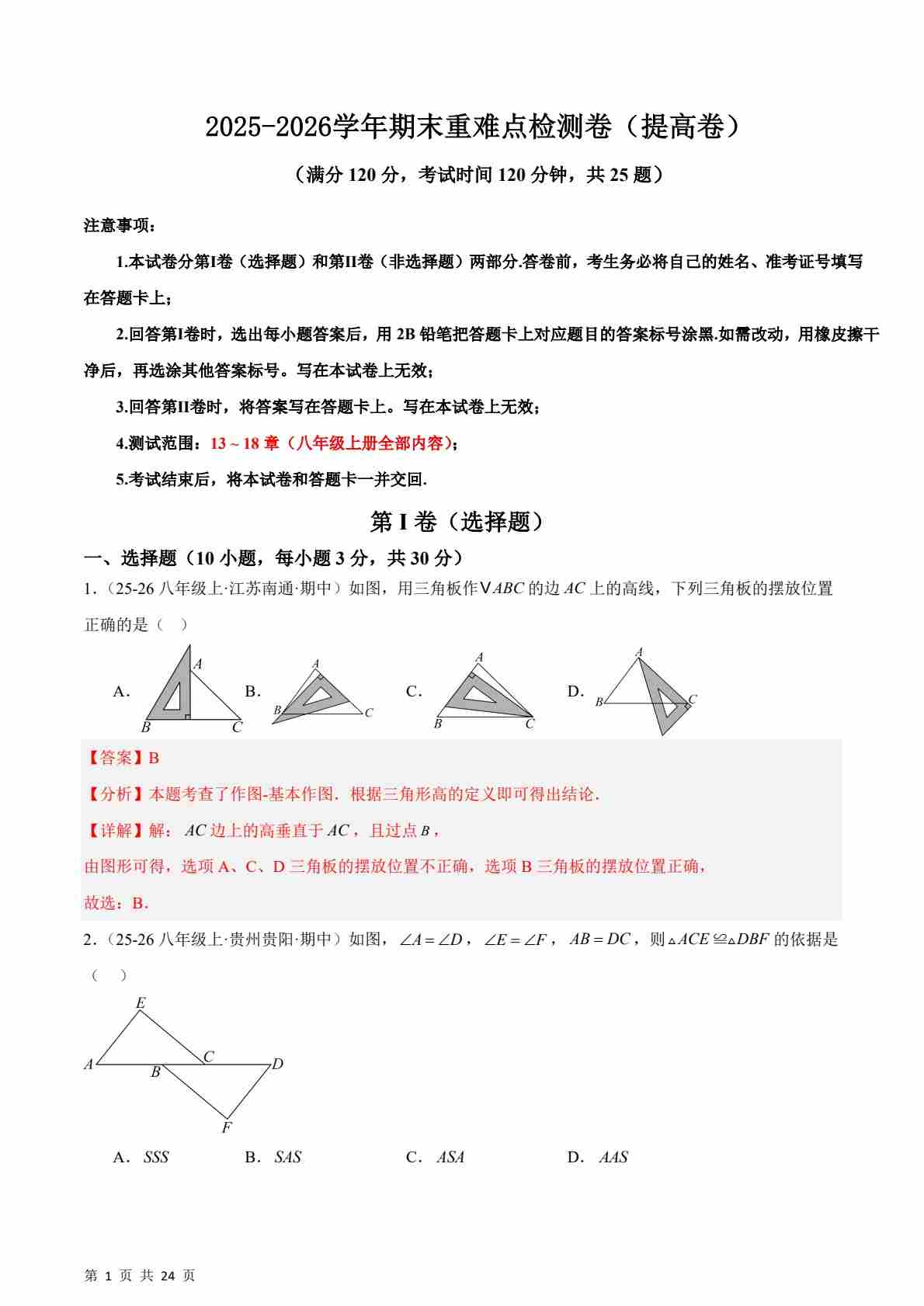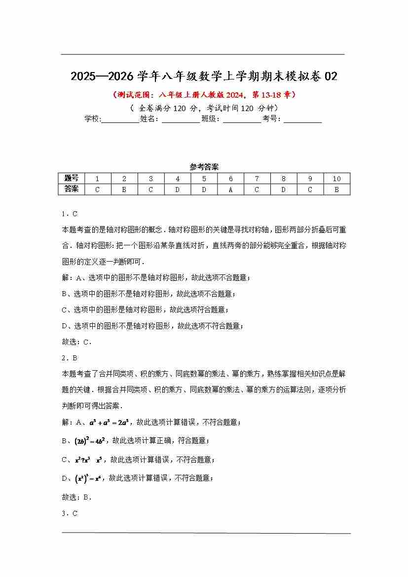 八年级数学上学期期末模拟卷02(人教版2024,测试范围:第13-18章) 答案