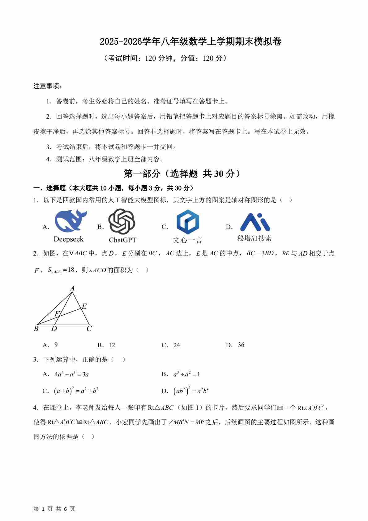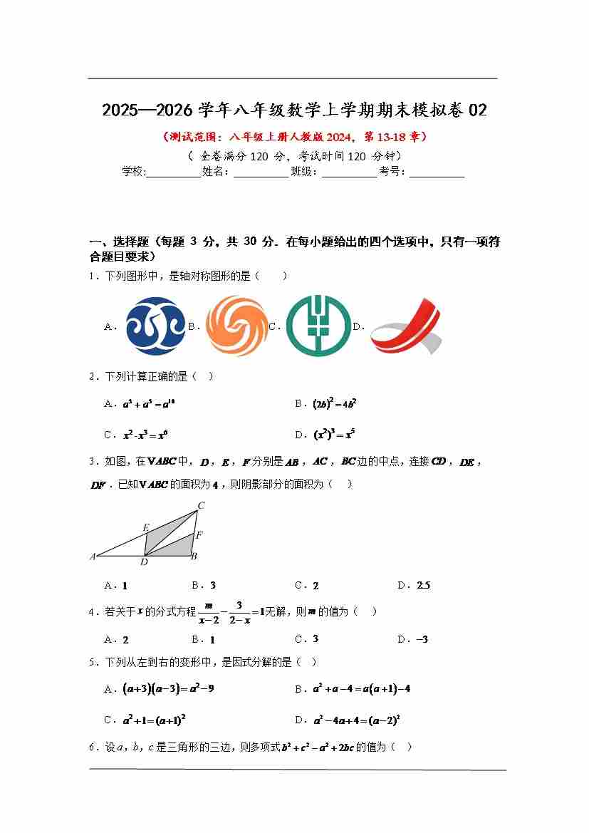 八年级数学上学期期末模拟卷02(人教版2024,测试范围:第13-18章)原卷