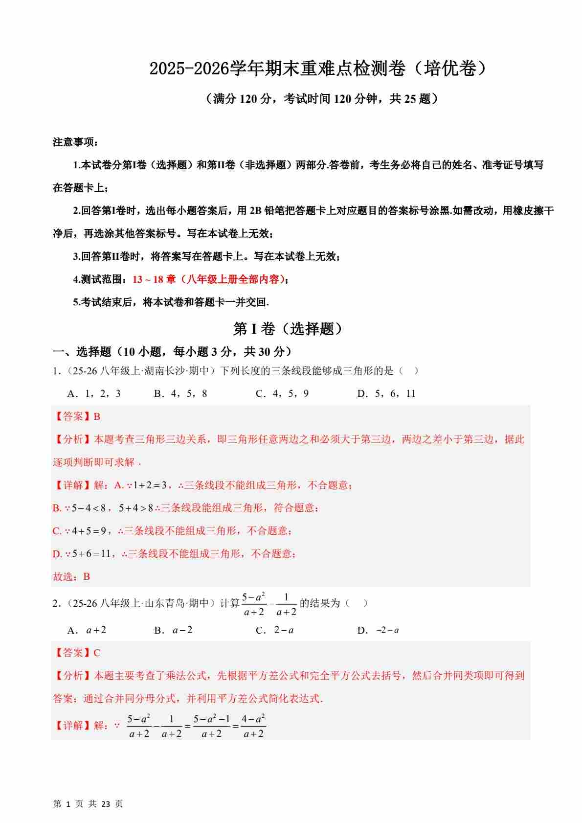 2025八上数学人教版期末重难点检测卷(培优卷)(解析版)
