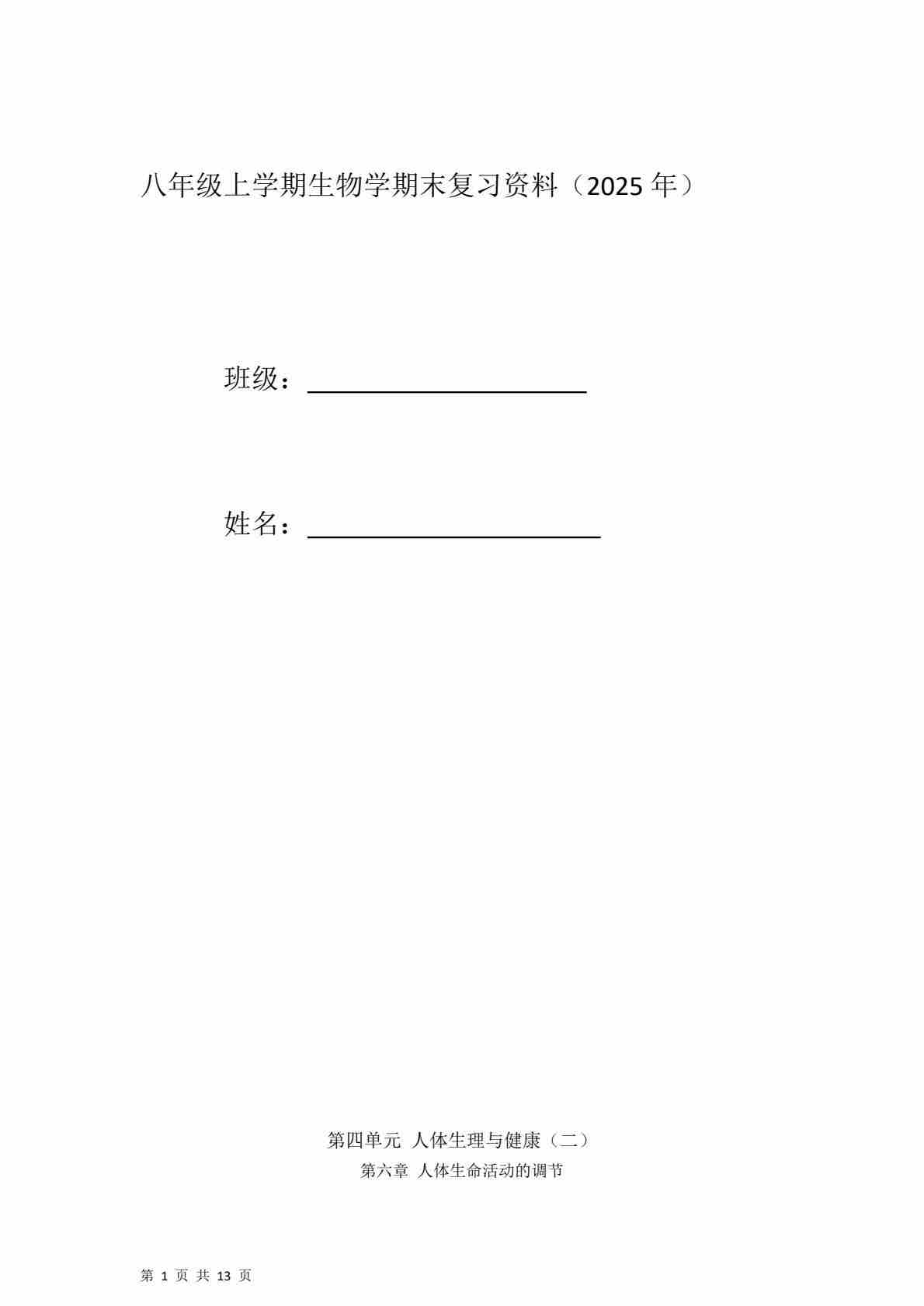 第四单元 第六章 人体生命活动的调节 (期末专项训练)(学生版)