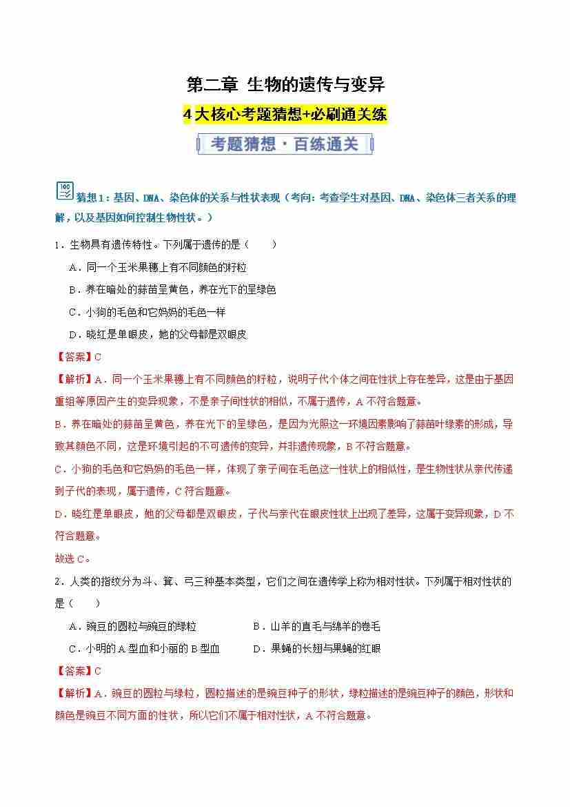 第六单元 第二章 生物的遗传与变异 (期末专项训练)(解析版)