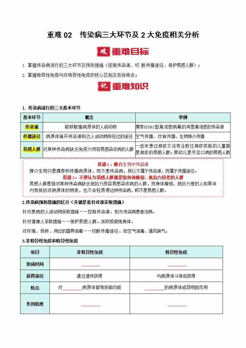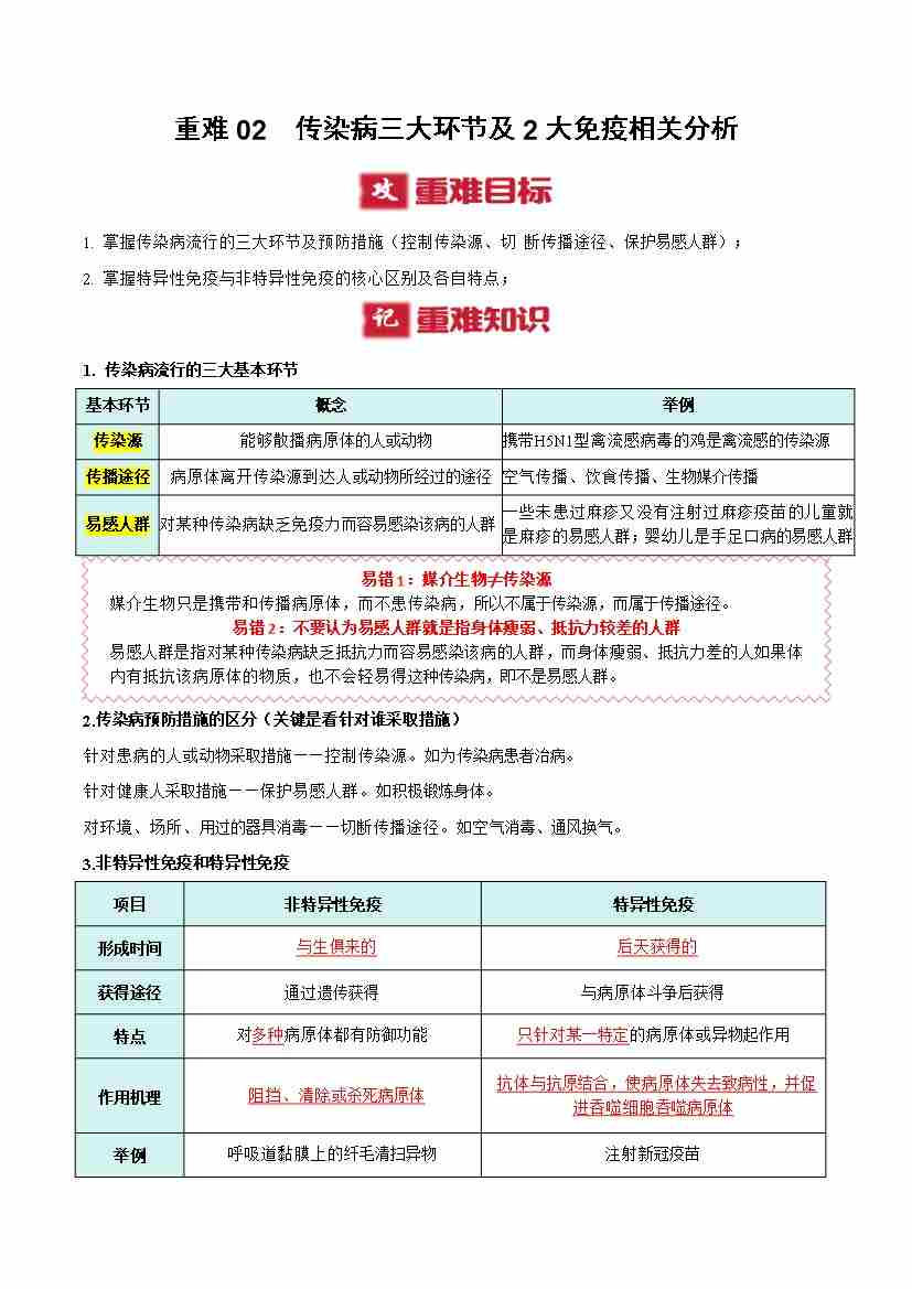 重难02 传染病三大环节及2大免疫相关分析(重难点突破讲义)(原卷版)