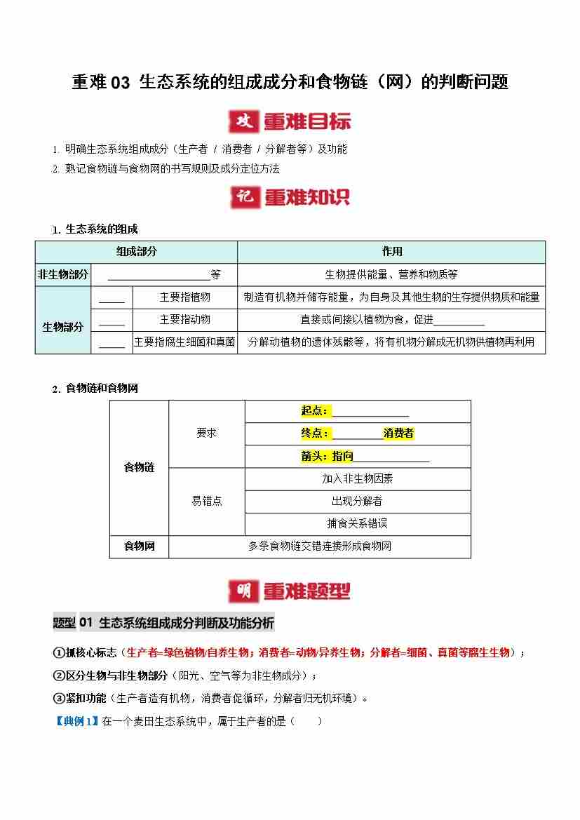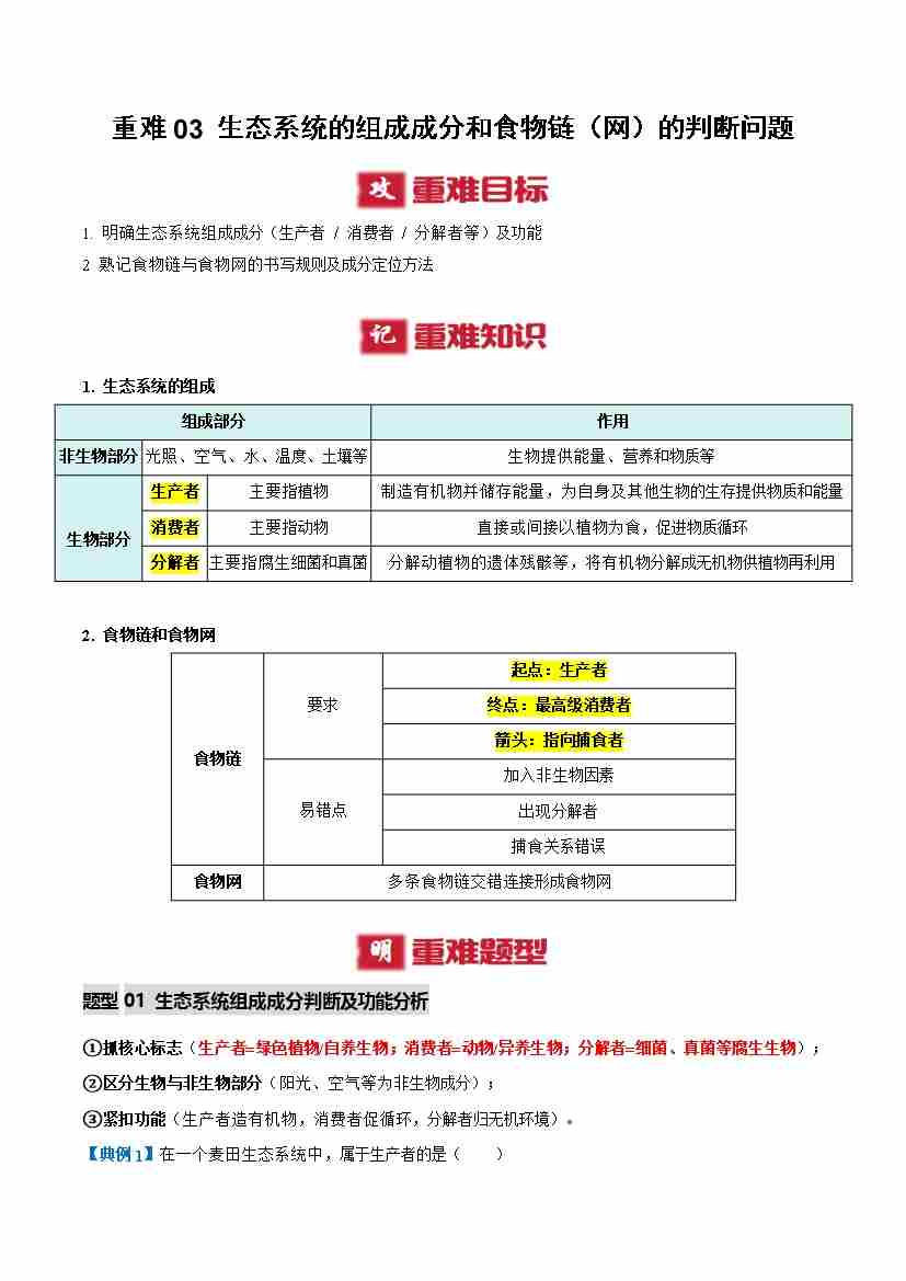 重难03 生态系统的组成成分和食物链(网)的判断问题(重难点突破讲义)(原卷版)