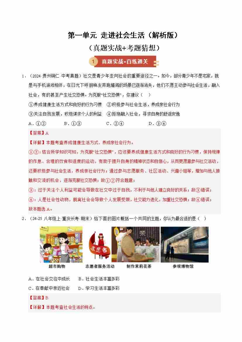 第一单元 走进社会生活(期末专项训练)(解析版)