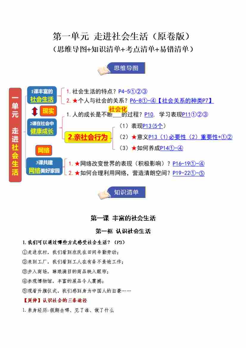 第一单元 走进社会生活(期末知识清单)(学生版)