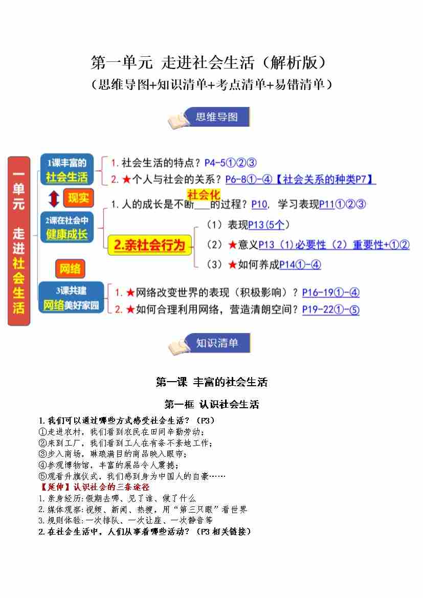第一单元 走进社会生活(期末知识清单)(教师版)