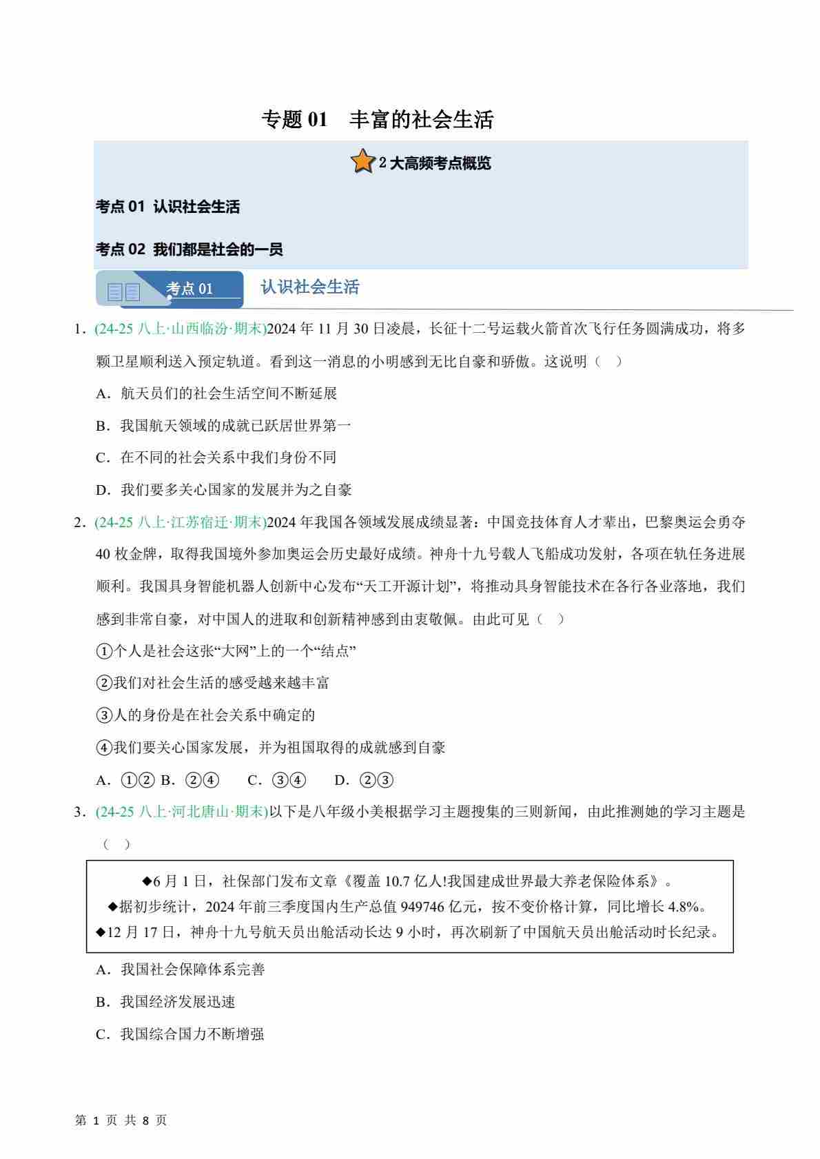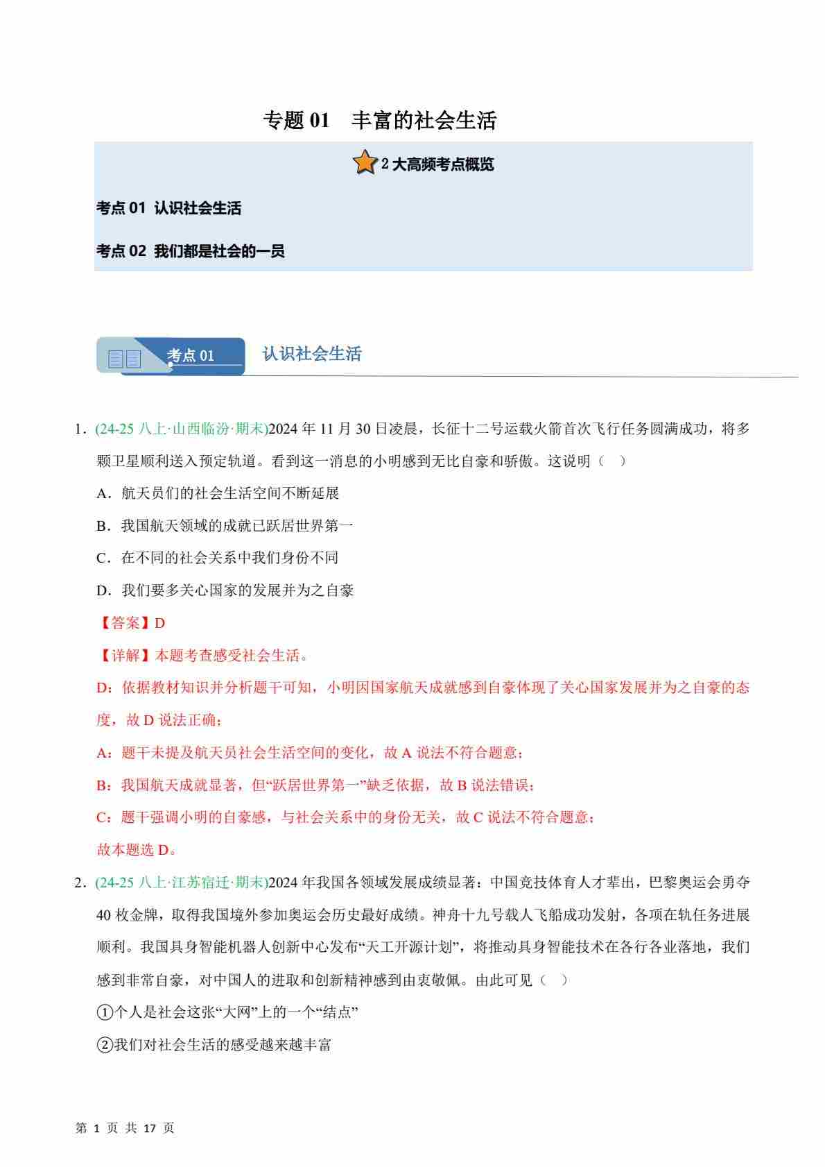 专题01 丰富的社会生活(期末真题汇编,统编版)(解析版)