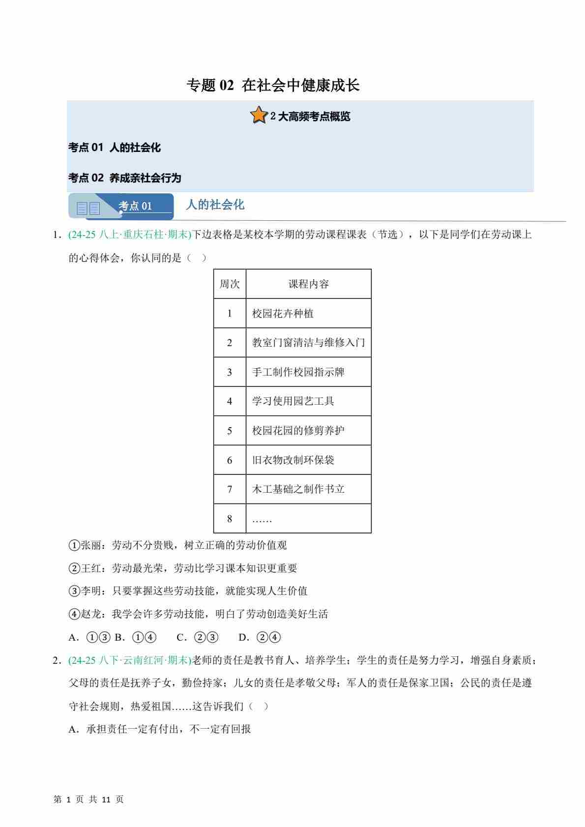 专题02 在社会中健康成长(期末真题汇编,统编版)(原卷版)