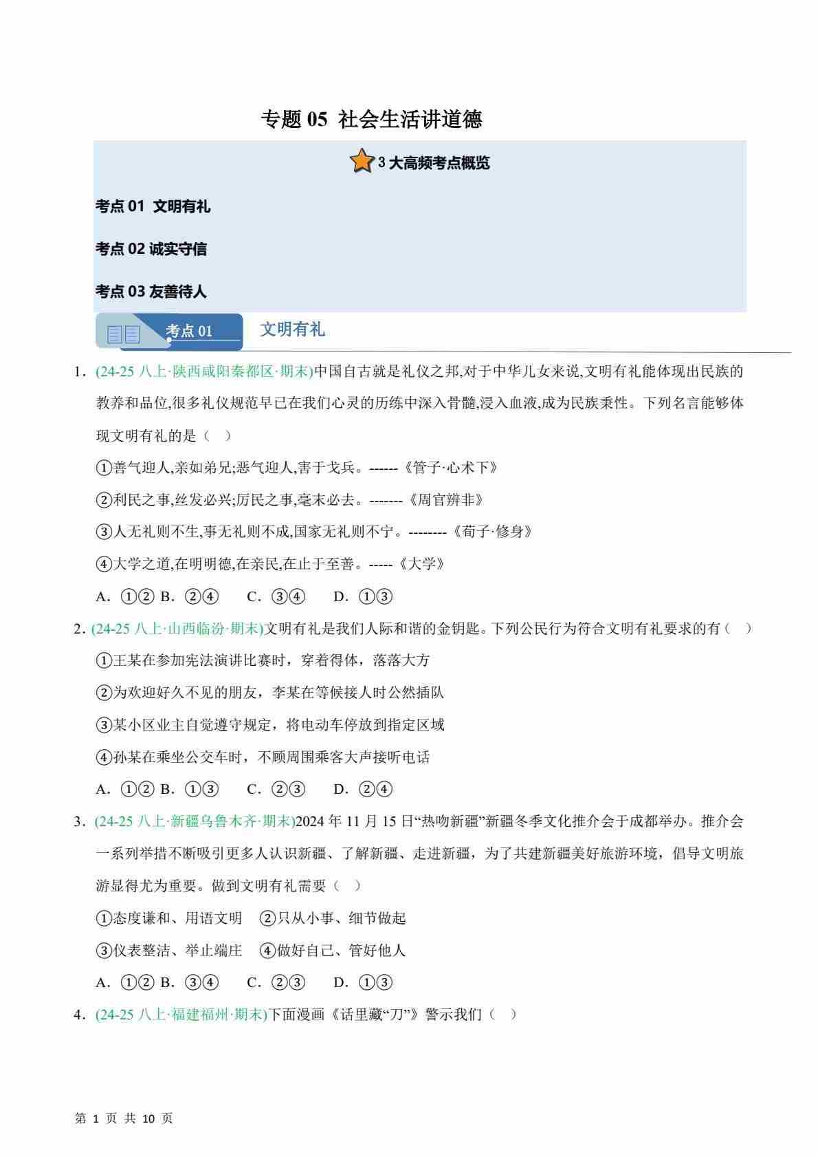 专题05 社会生活讲道德(期末真题汇编,统编版)(原卷版)