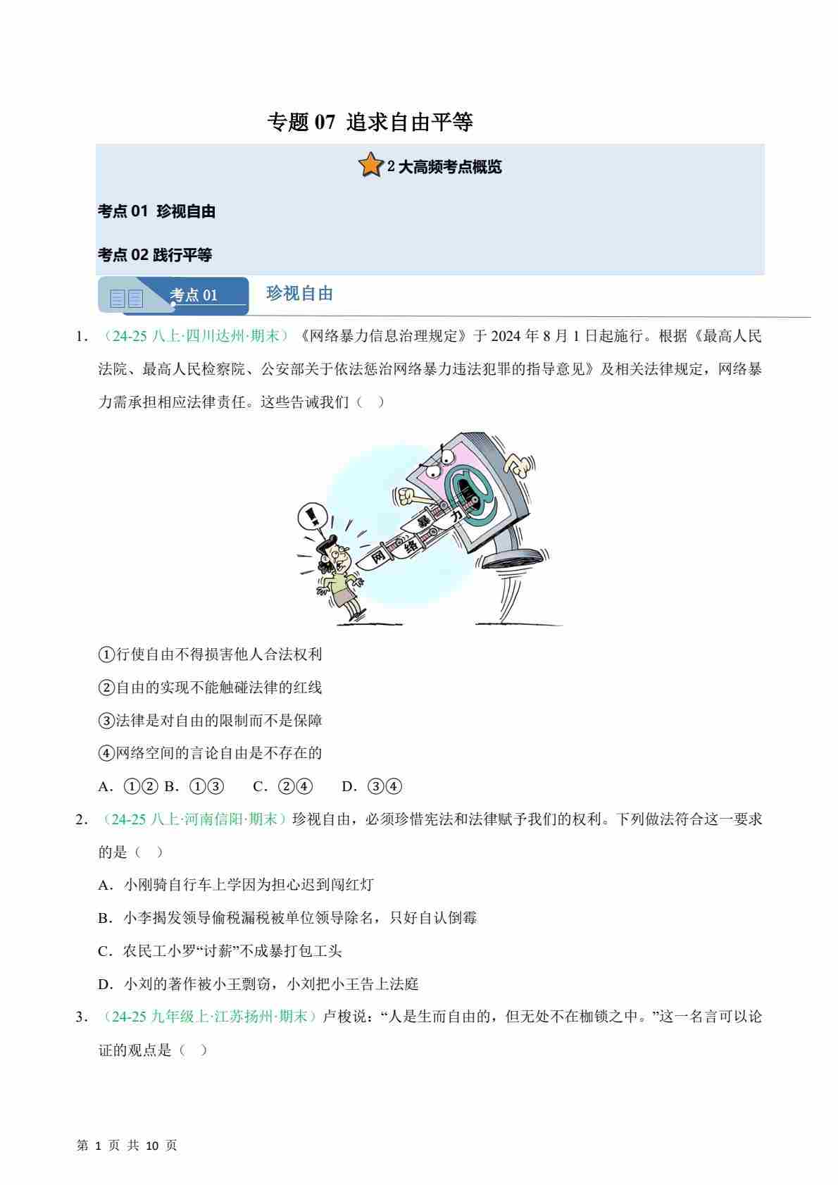 专题07 追求自由平等(期末真题汇编,统编版)(原卷版)