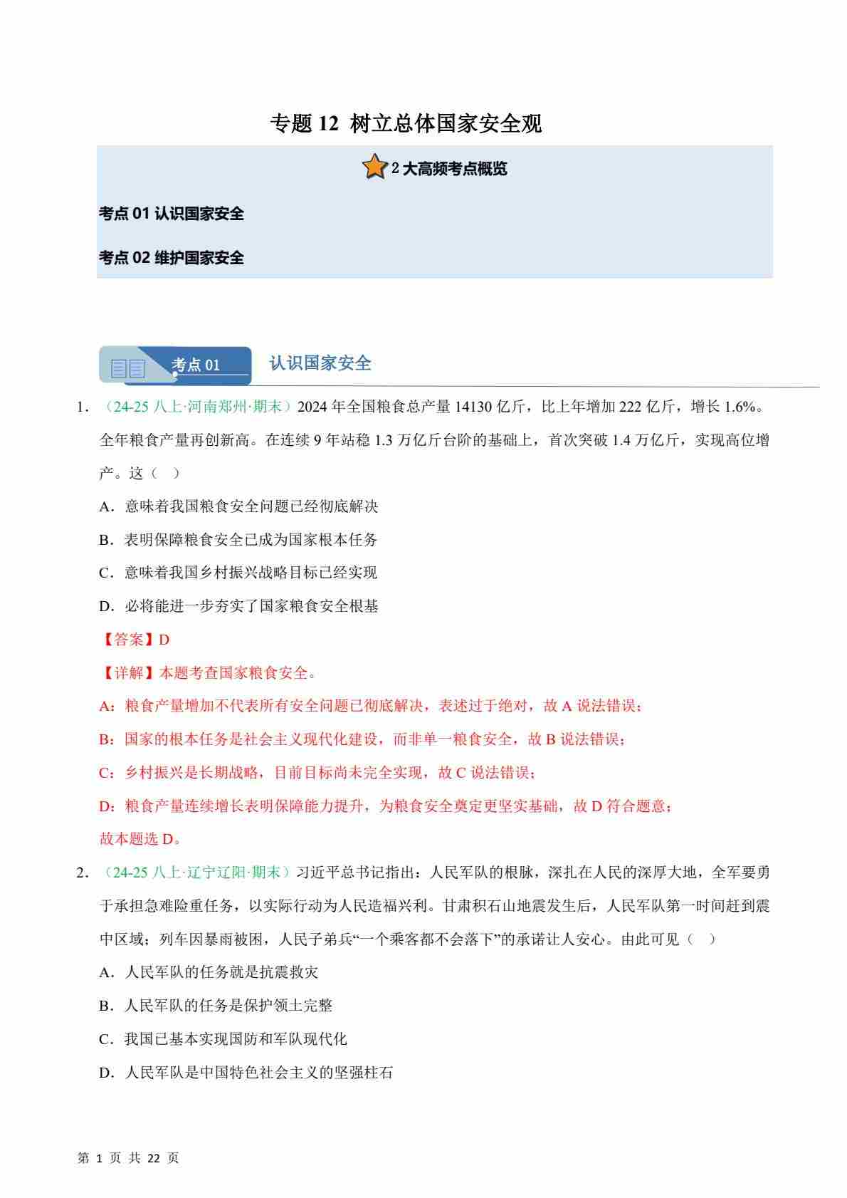 专题12 树立总体国家安全观(期末真题汇编,统编版)(解析版)