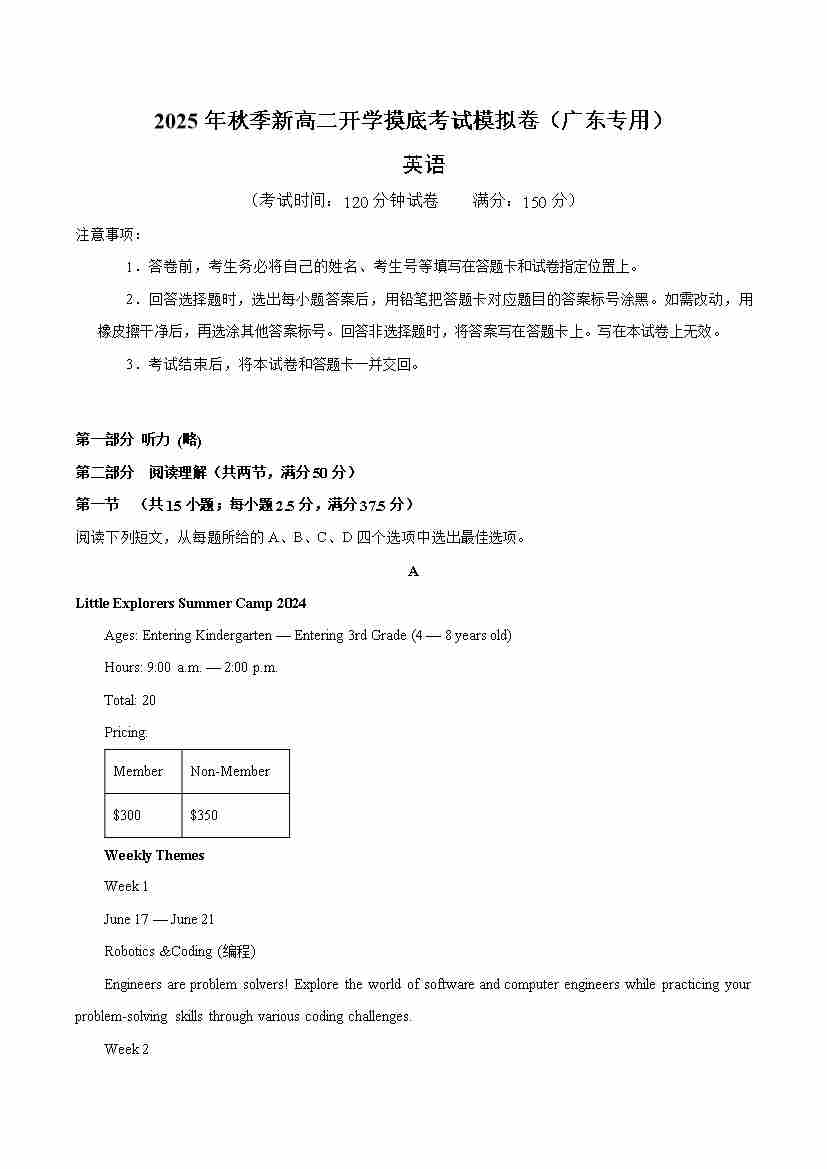 英语01(广东专用)(考试版A4)