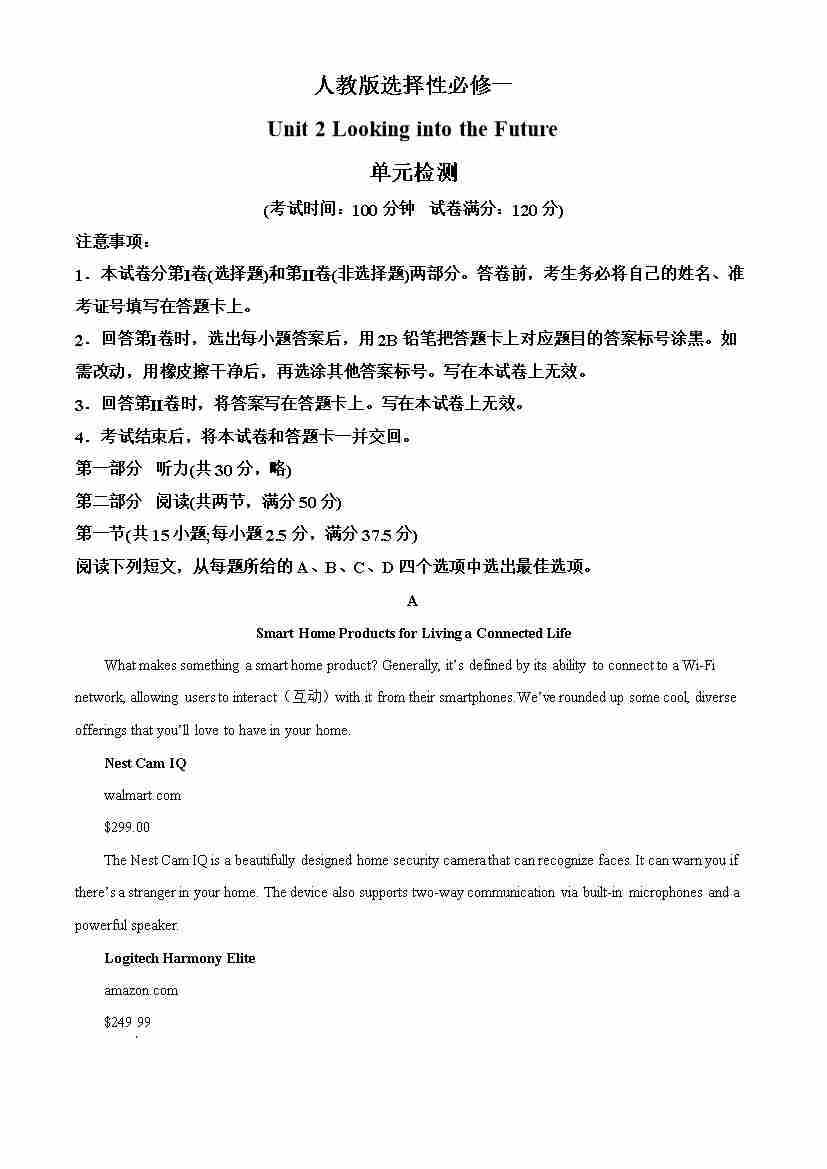 人教版 选择性必修一 Unit 2 Looking into the Future 单元检测(学生版)