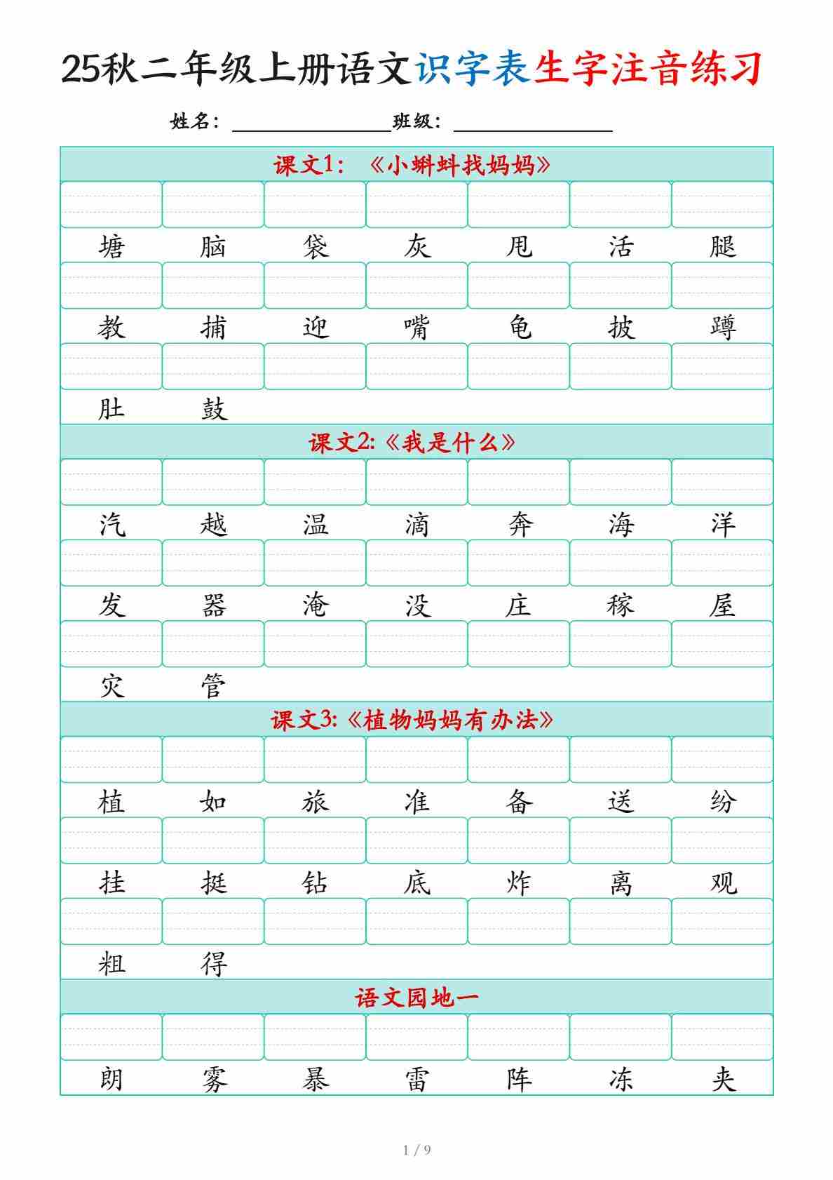 二(上)语文【25秋(识字表)生字注音练习(460个字9页)】