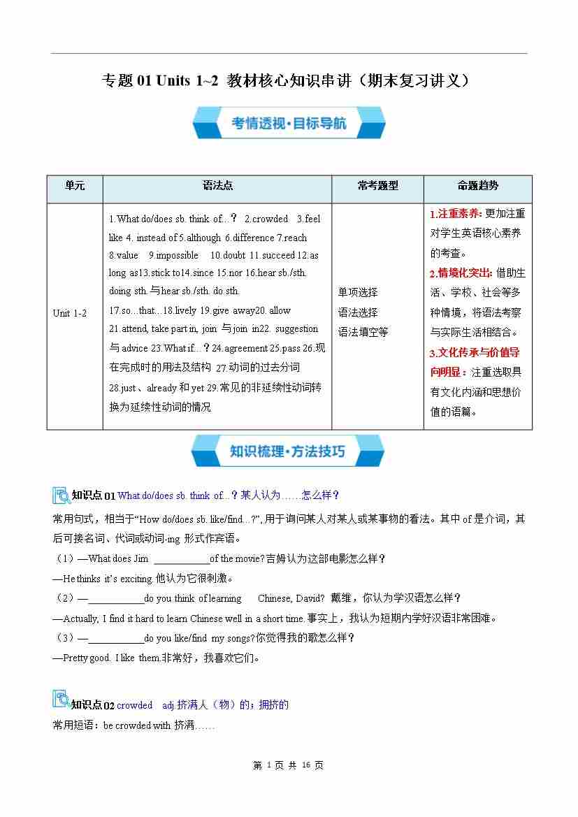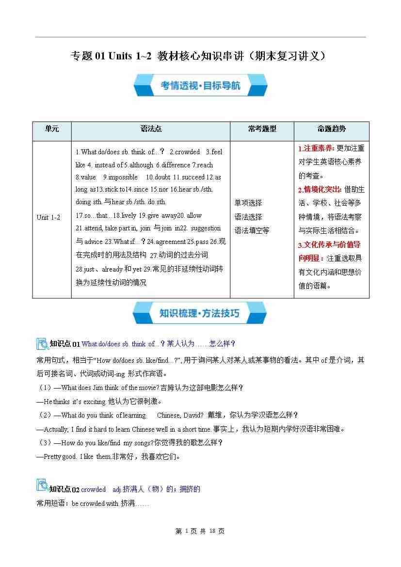 专题01 Units 1~2 教材核心知识串讲(期末复习讲义)(解析版)
