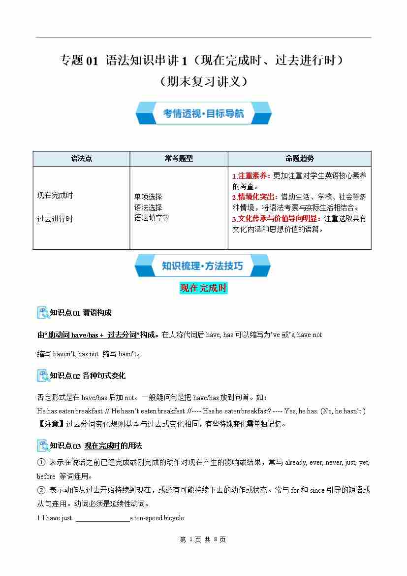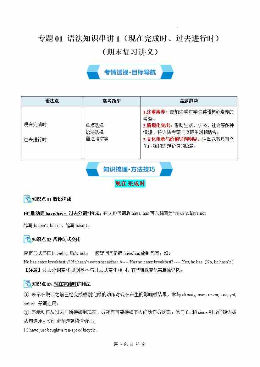 专题01 语法知识串讲1(现在完成时、过去进行时)(期末复习讲义)(解析版)