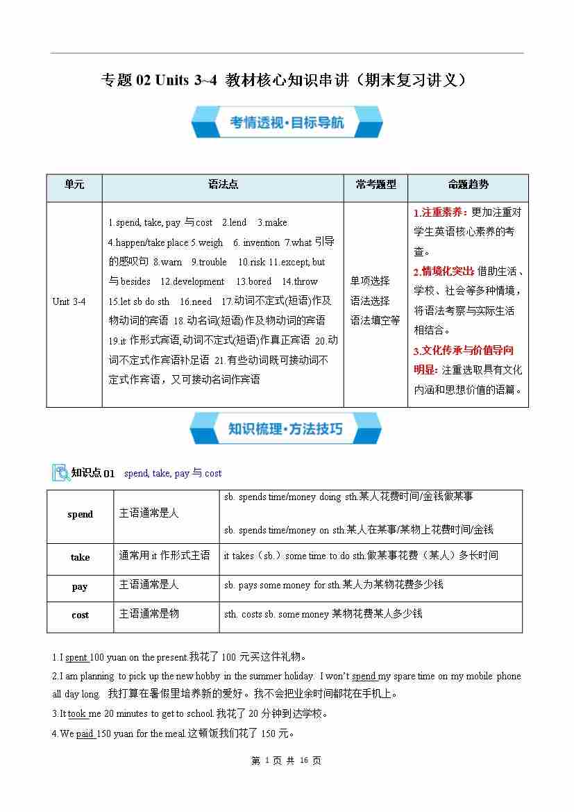 专题02 Units 3~4 教材核心知识串讲(期末复习讲义)(解析版)