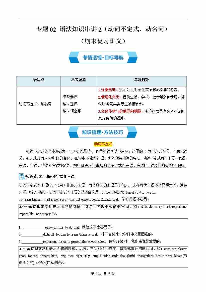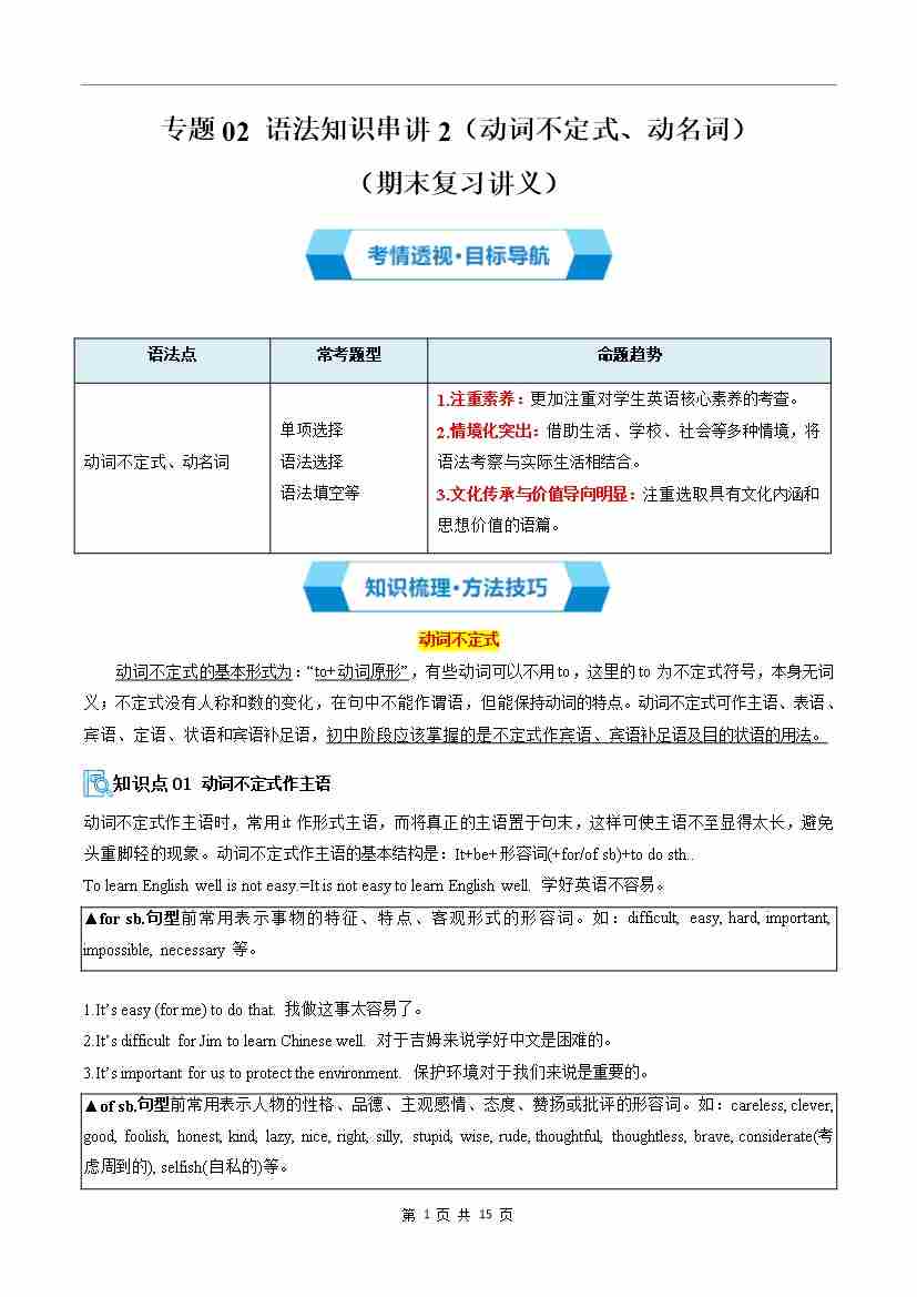 专题02 语法知识串讲2(动词不定式、动词ing)(期末复习讲义)(解析版)
