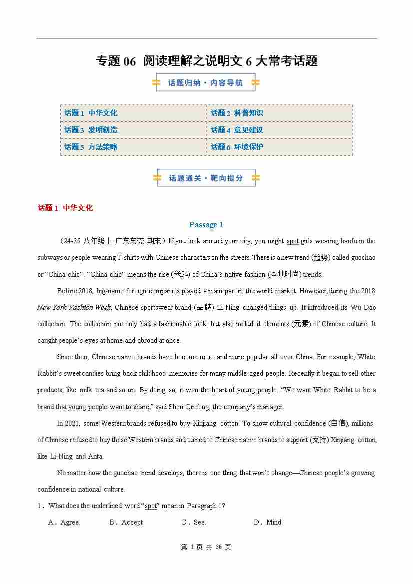 考前押题06 阅读理解之说明文6大常考话题(期末复习专项训练)(解析版)