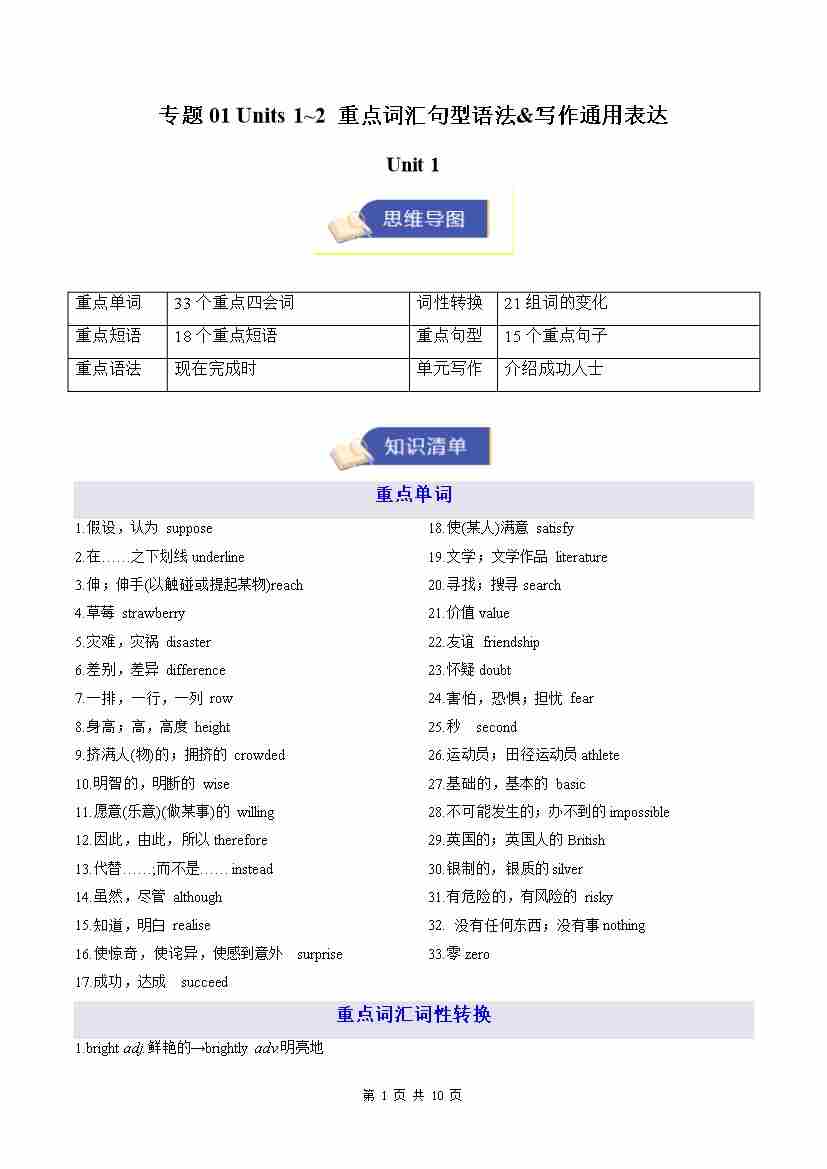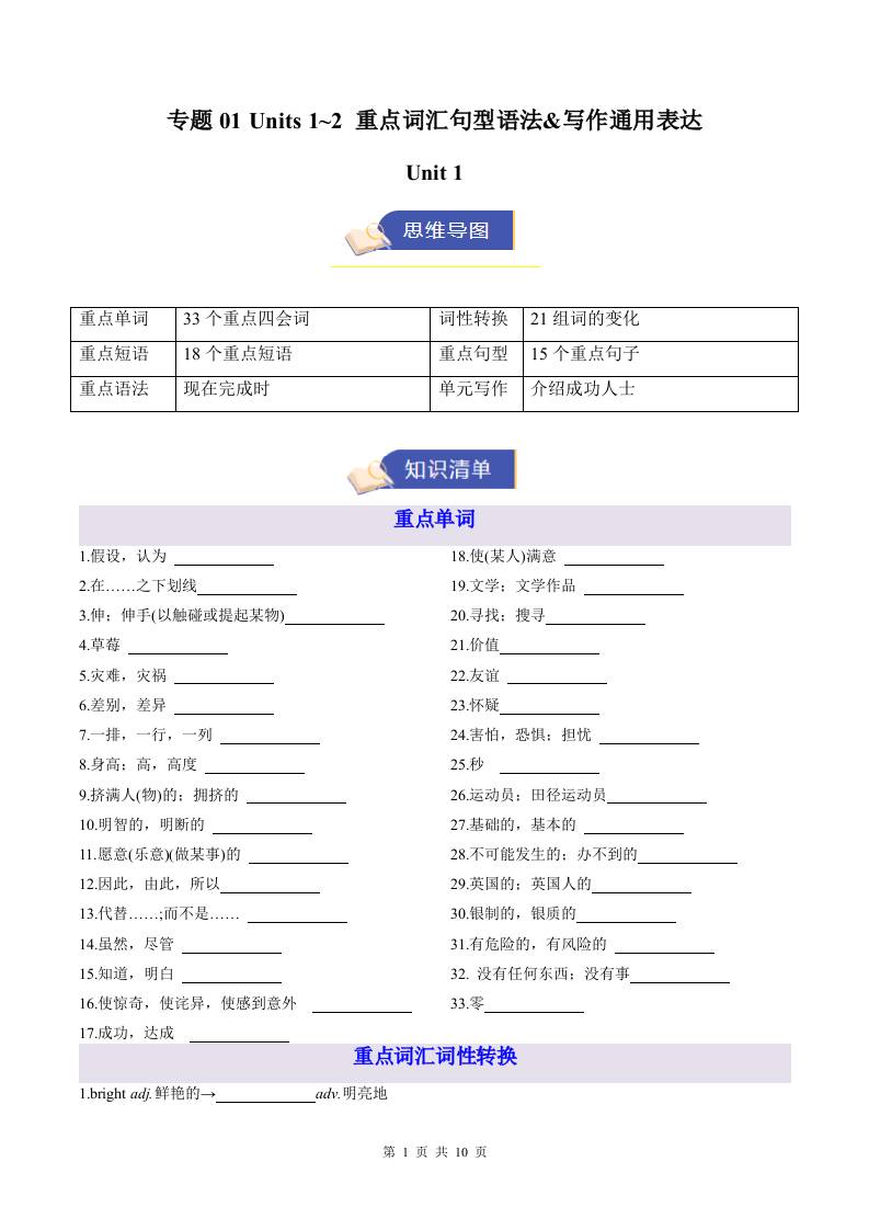 专题01 Units 1~2 重点词汇句型语法&写作通用表达(期末复习知识清单)(默写版)外研八上2