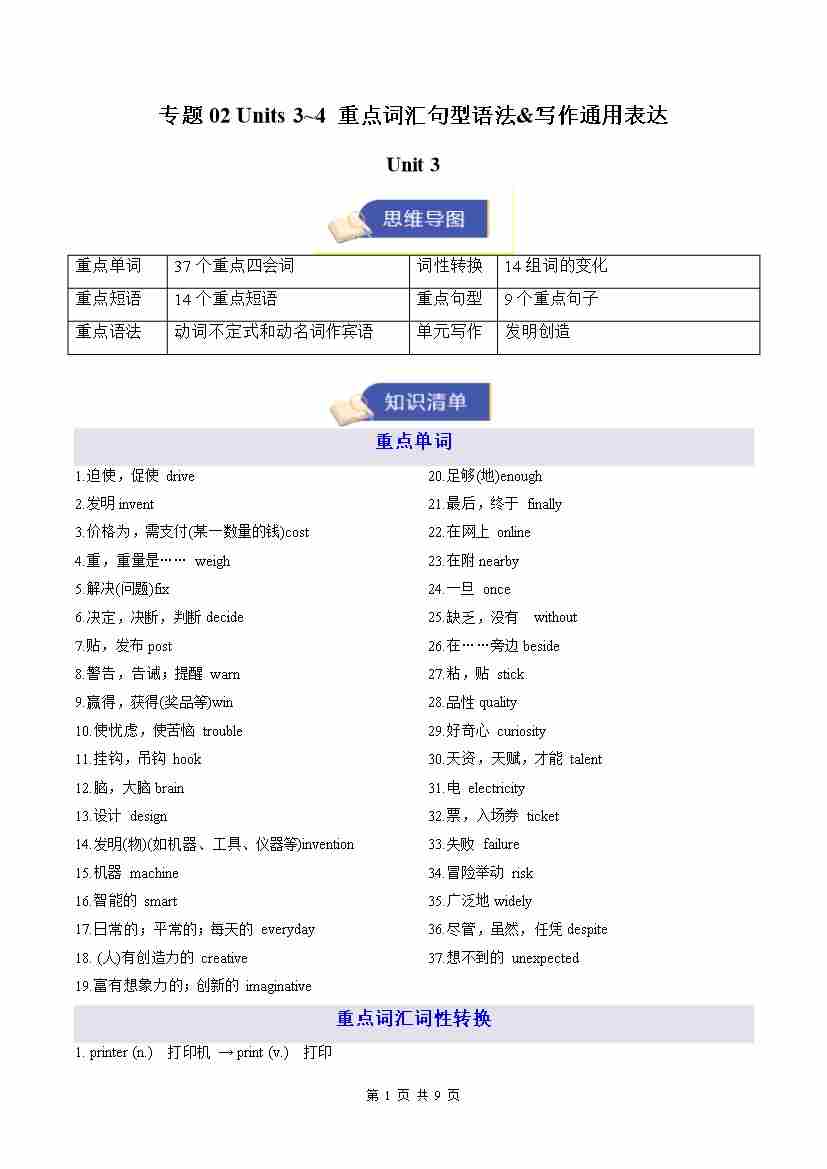 专题02 Units 3~4 重点词汇句型语法&写作通用表达(期末复习知识清单)(背诵版)八上外研