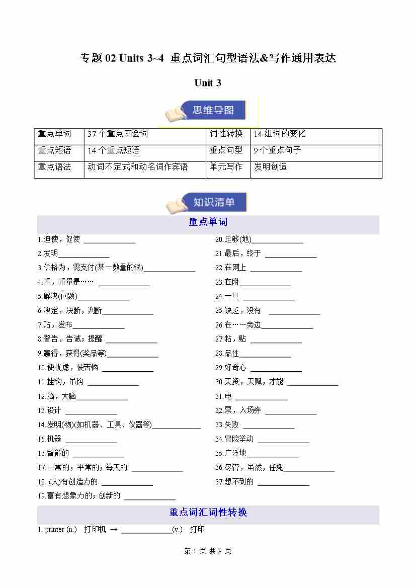 专题02 Units 3~4 重点词汇句型语法&写作通用表达(期末复习知识清单)(默写版)八上外研