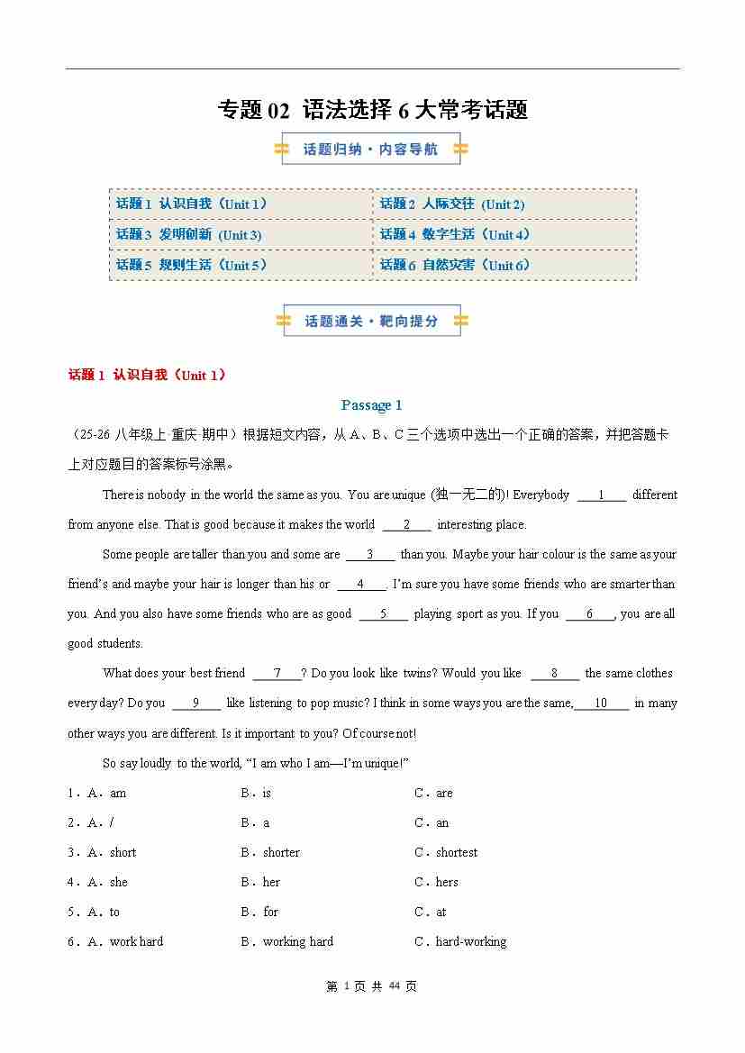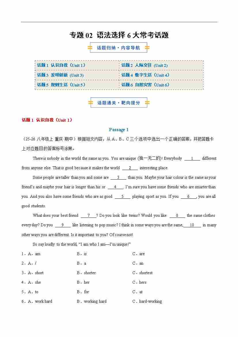 考前押题02 语法选择6大常考话题(期末复习专项训练)(原卷版)