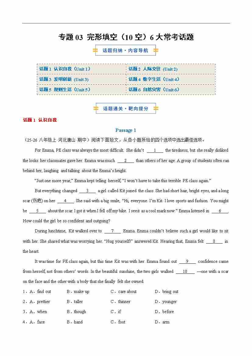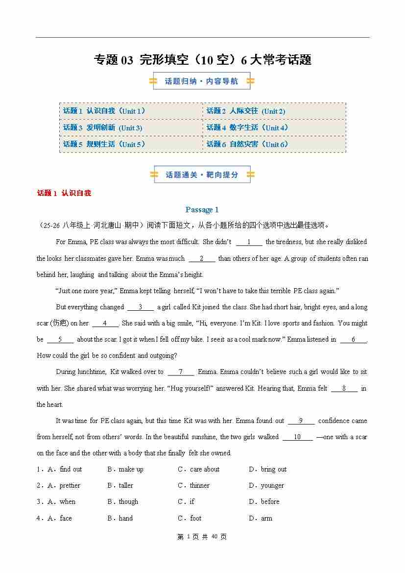 考前押题03 完形填空(10空)6大常考话题(期末复习专项训练)(原卷版)