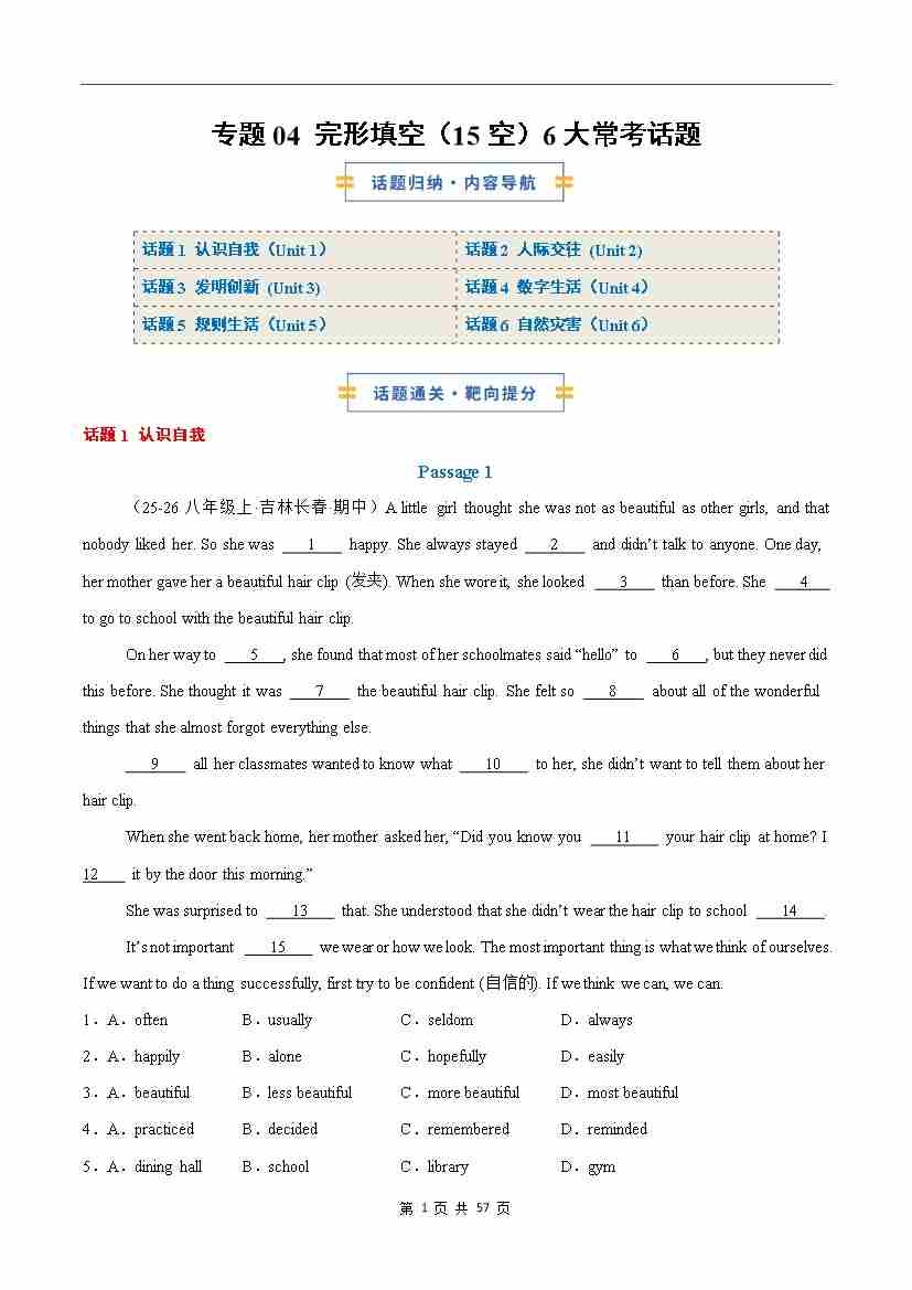 考前押题04 完形填空(15空)6大常考话题(期末复习专项训练)(原卷版)