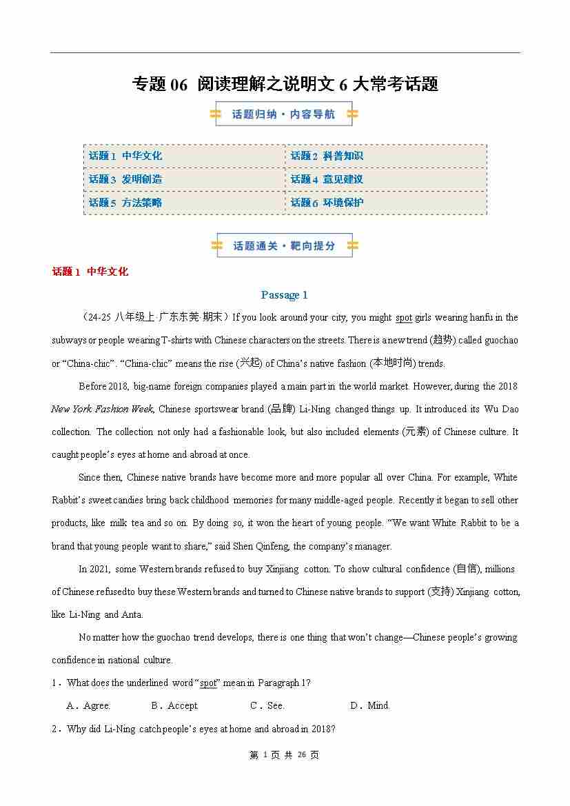 考前押题06 阅读理解之说明文6大常考话题(期末复习专项训练)(原卷版)