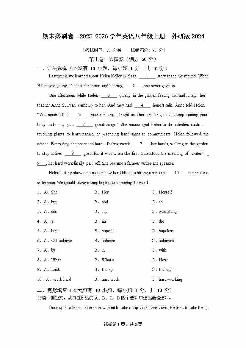 期末必刷卷 -2025-2026学年英语八年级上册 外研版2024 原卷