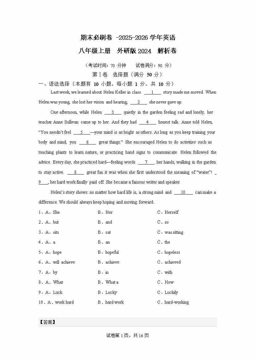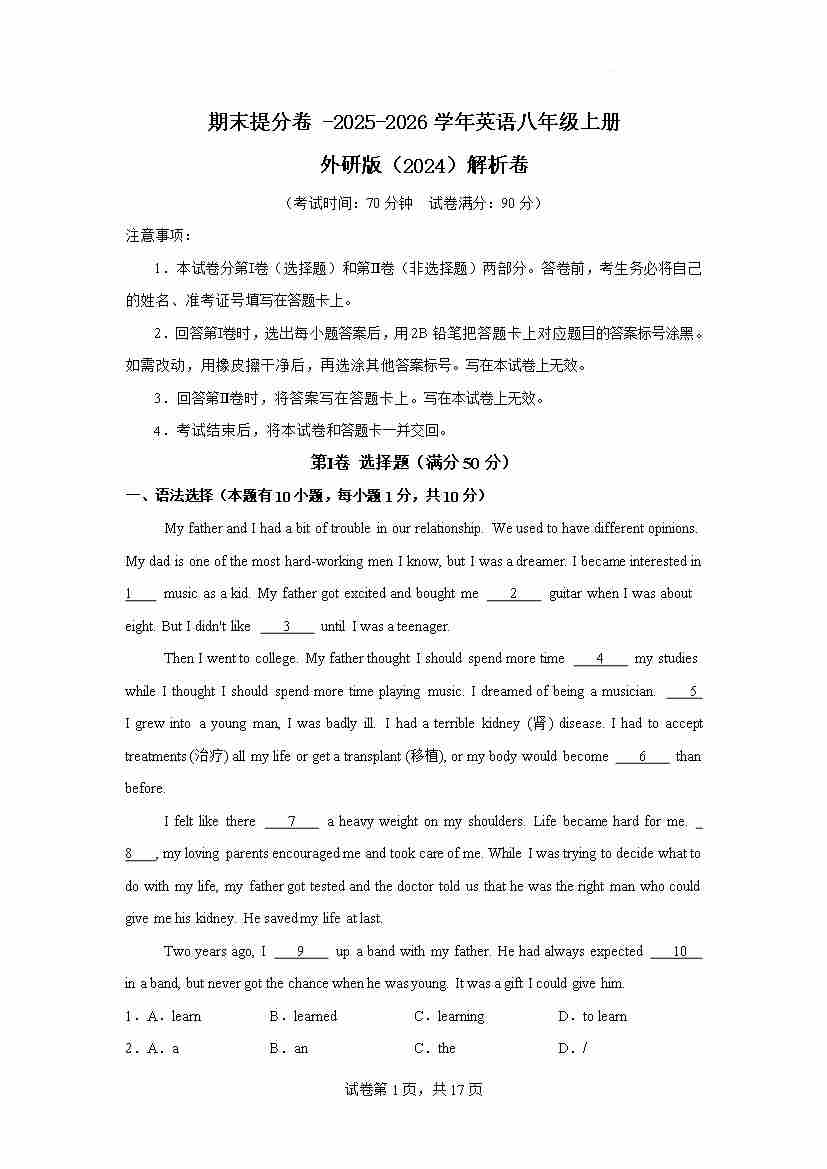 期末提分卷 -2025-2026学年英语八年级上册 外研版(2024)解析卷