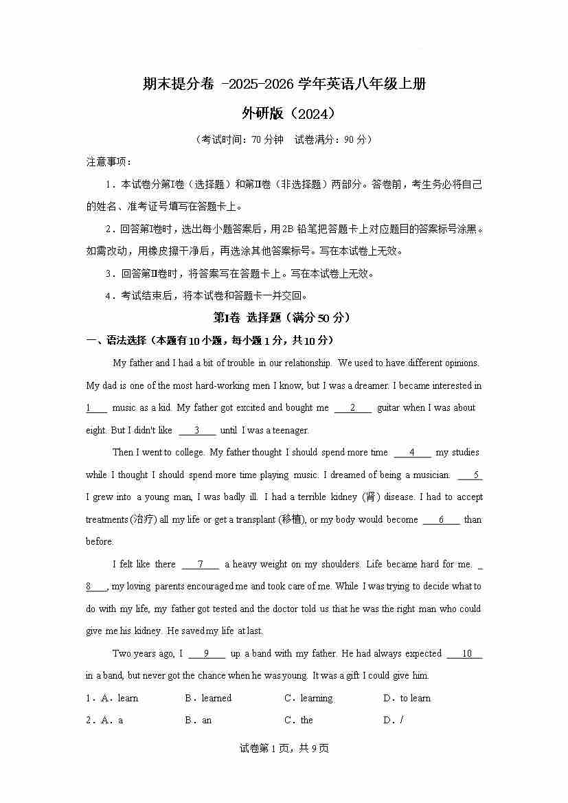 期末提分卷 -2025-2026学年英语八年级上册 外研版(2024)原卷
