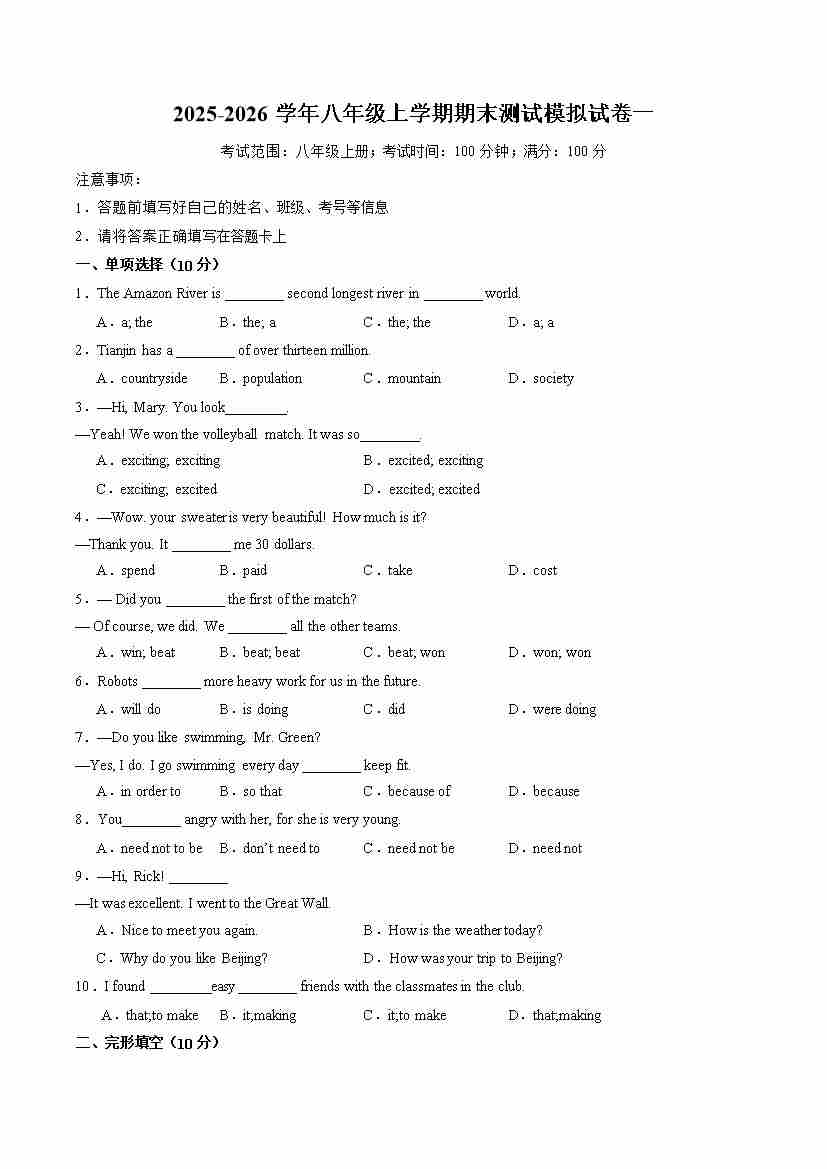 2025-2026学年外研版英语八年级上册期末模拟测试题(无听力)